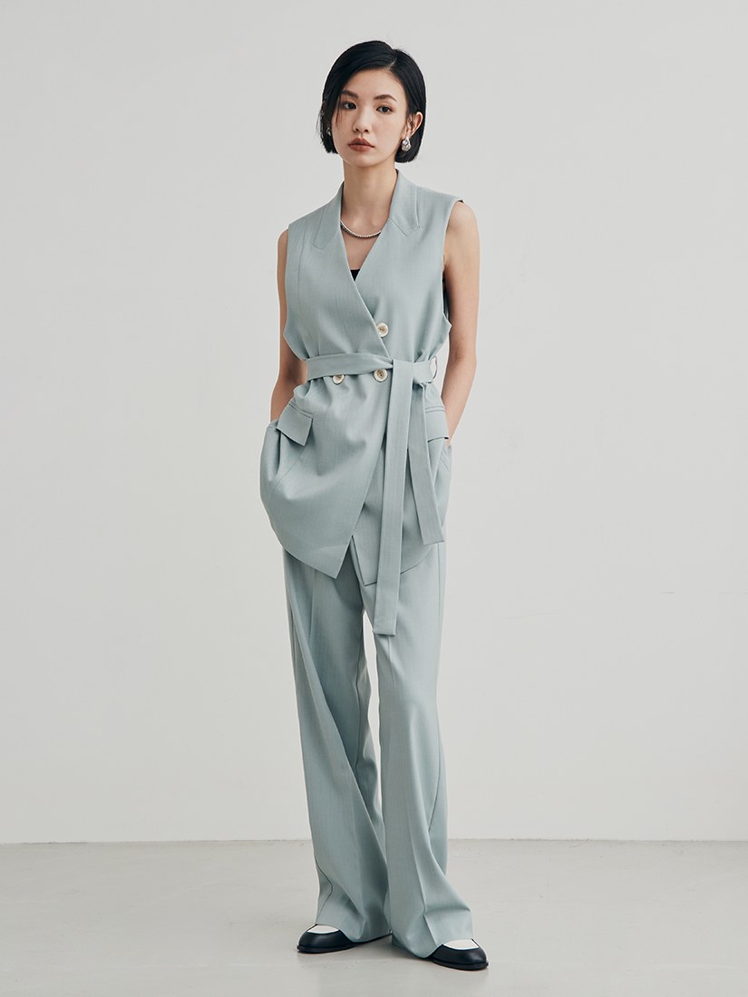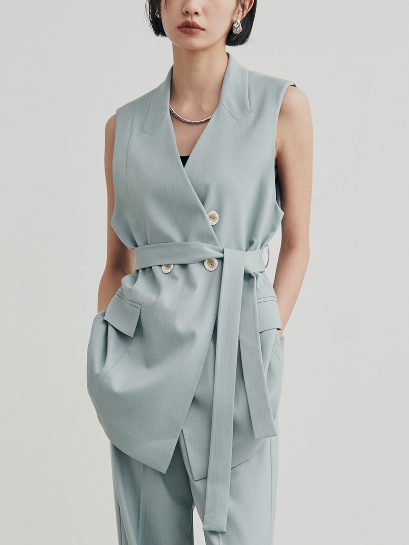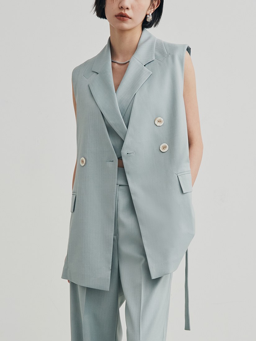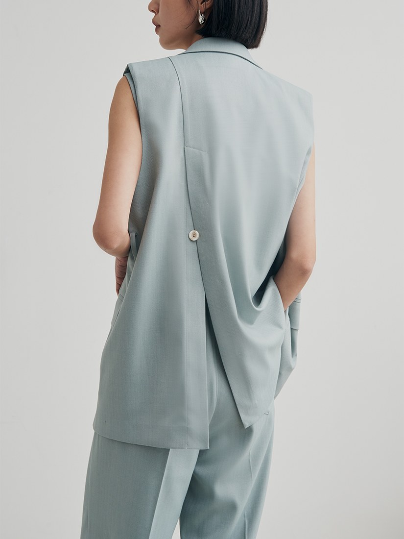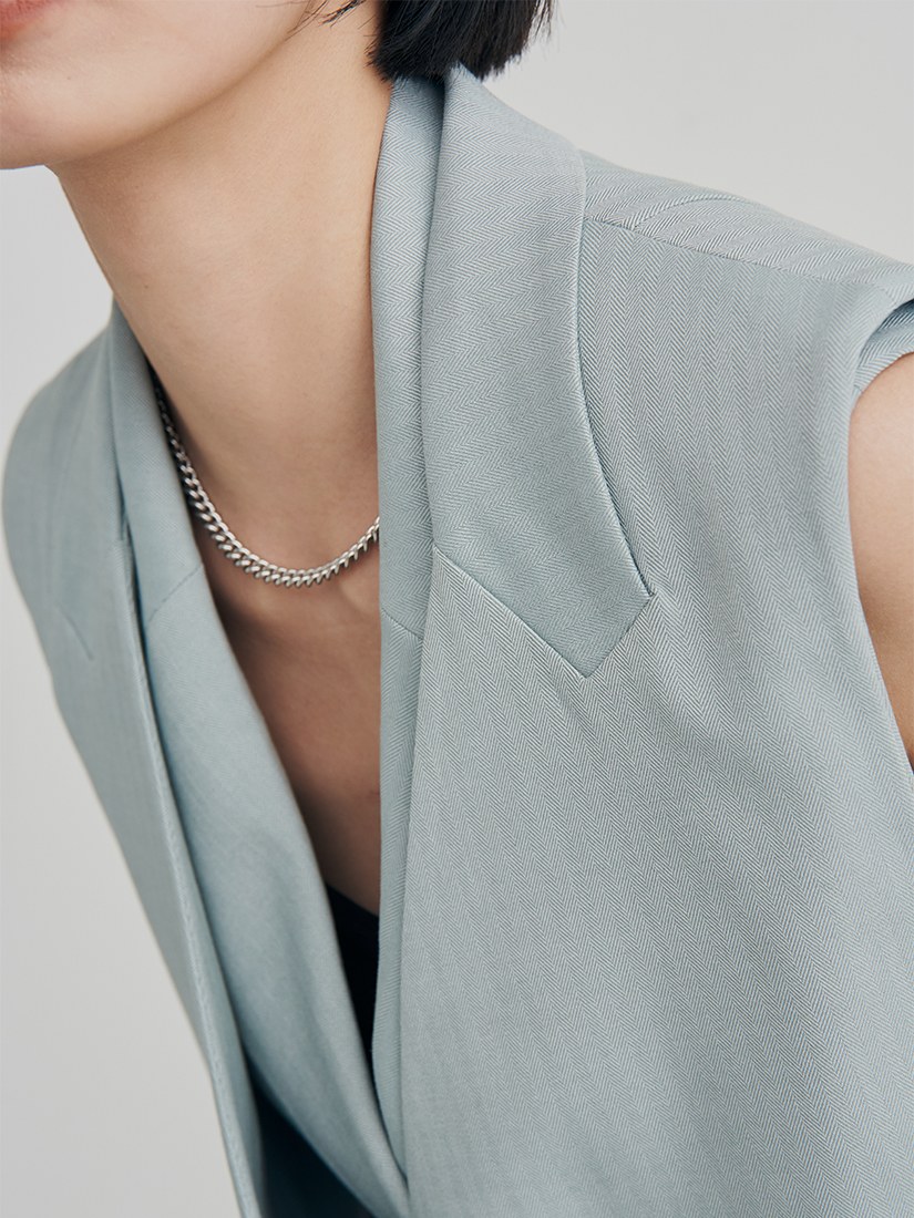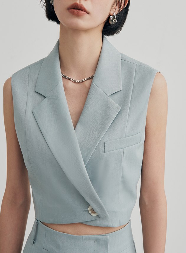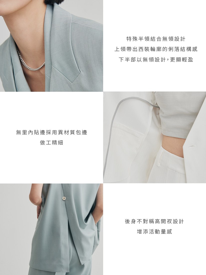 - 特殊半領結合無領設計,上領帶出西裝輪廓的俐落結構感,下半部以無領設計,更顯輕盈