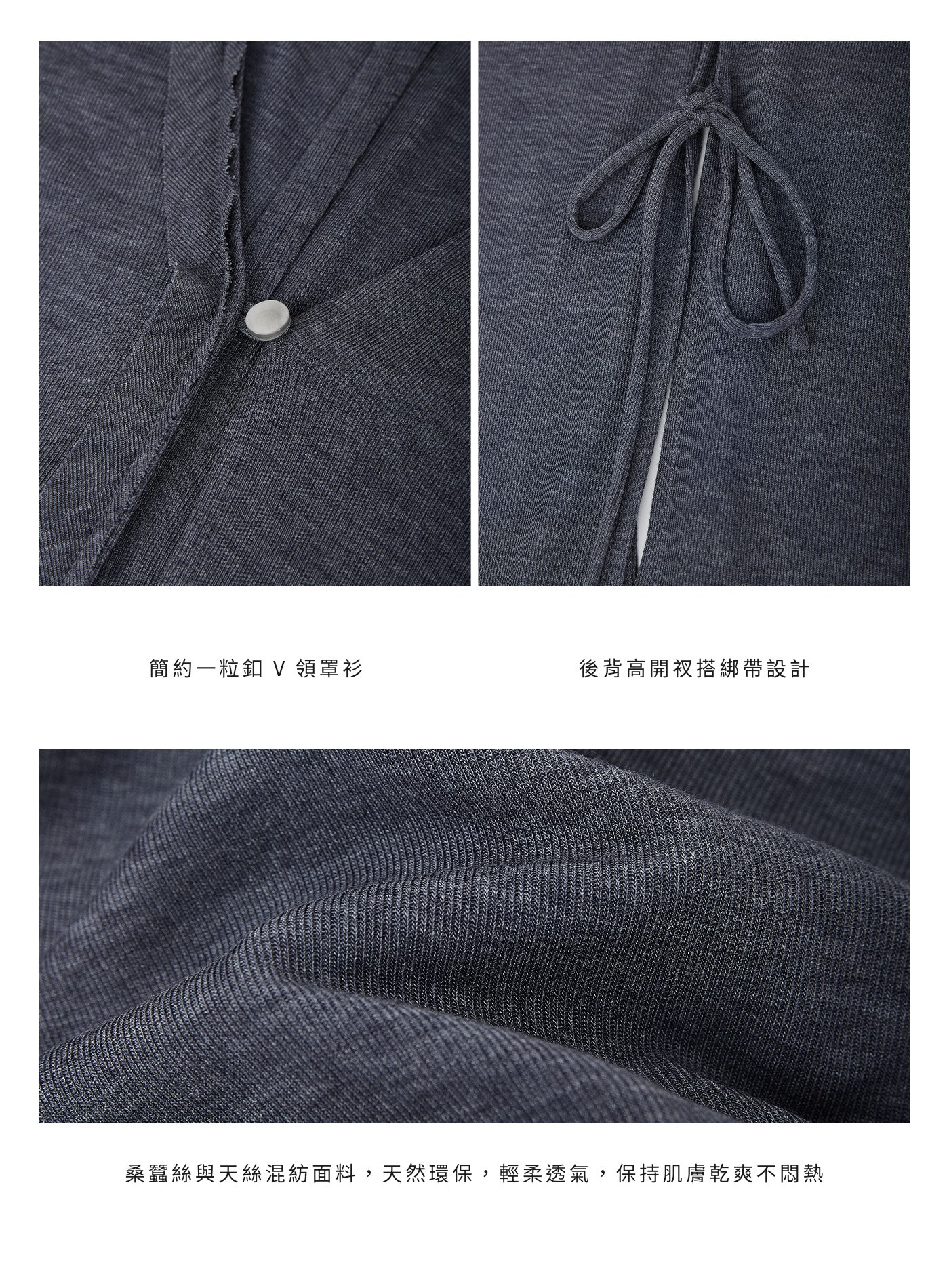 - 桑蠶絲與天絲混紡面料,天然環保,輕柔透氣,保持肌膚乾爽不悶熱,冷氣房穿著也舒適