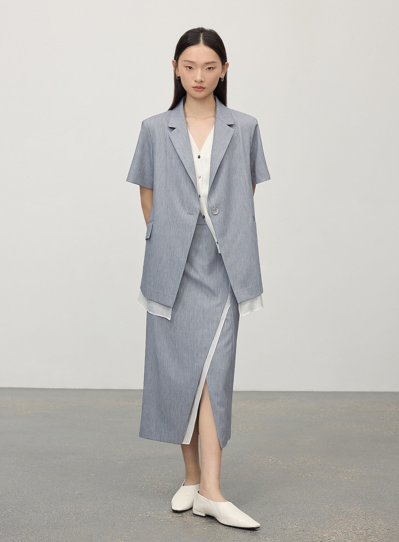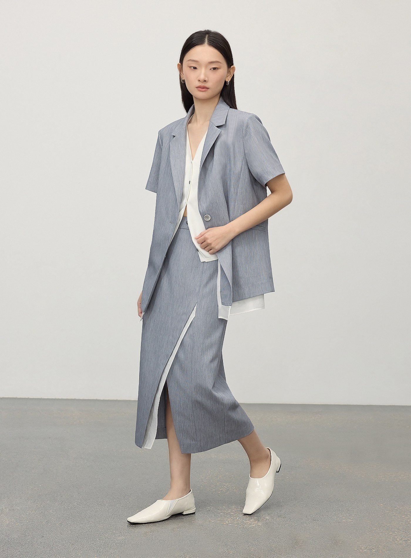 - 可與 ‘俐落假兩件式H型短袖西裝外套’ 搭成套裝
