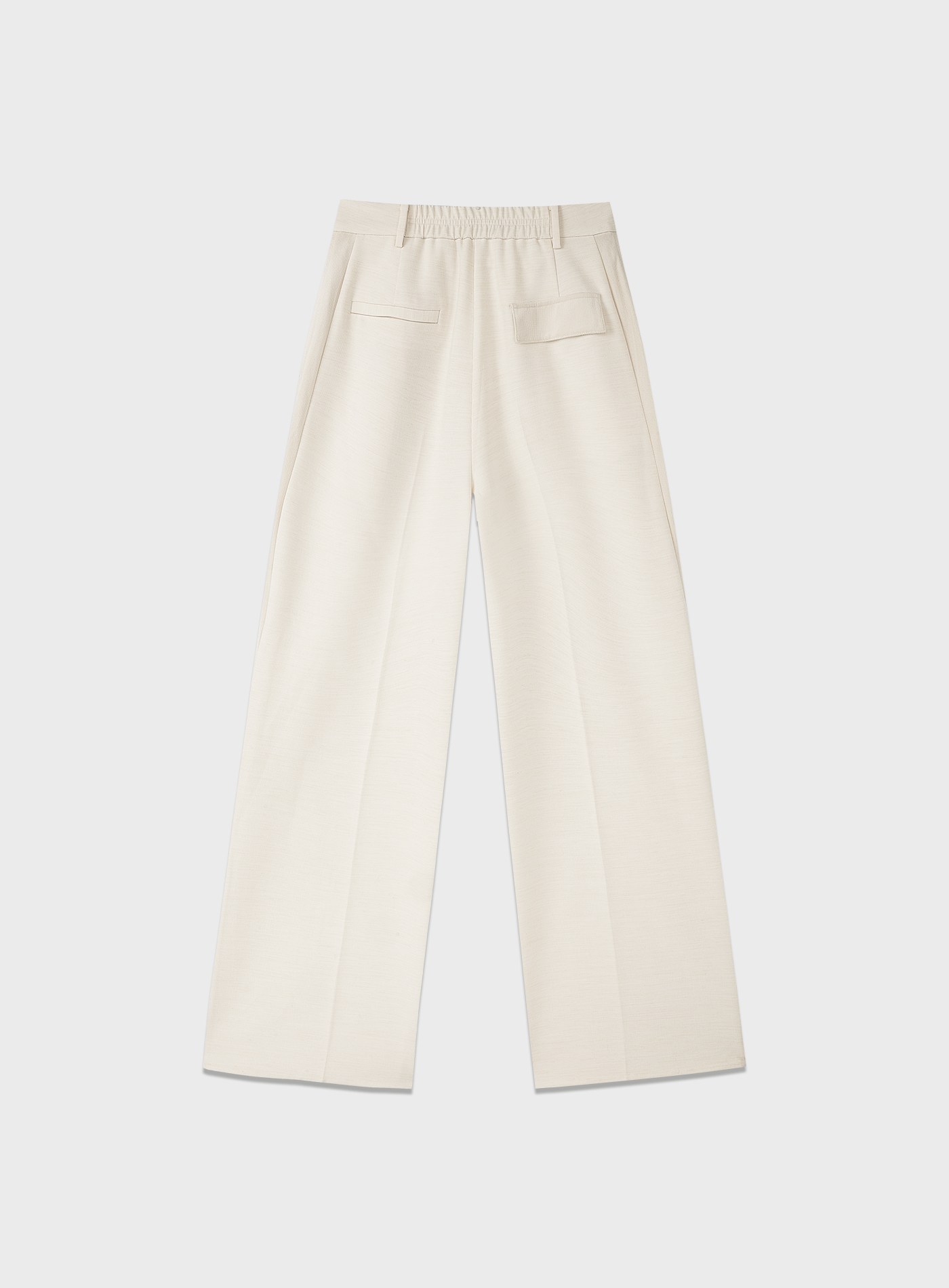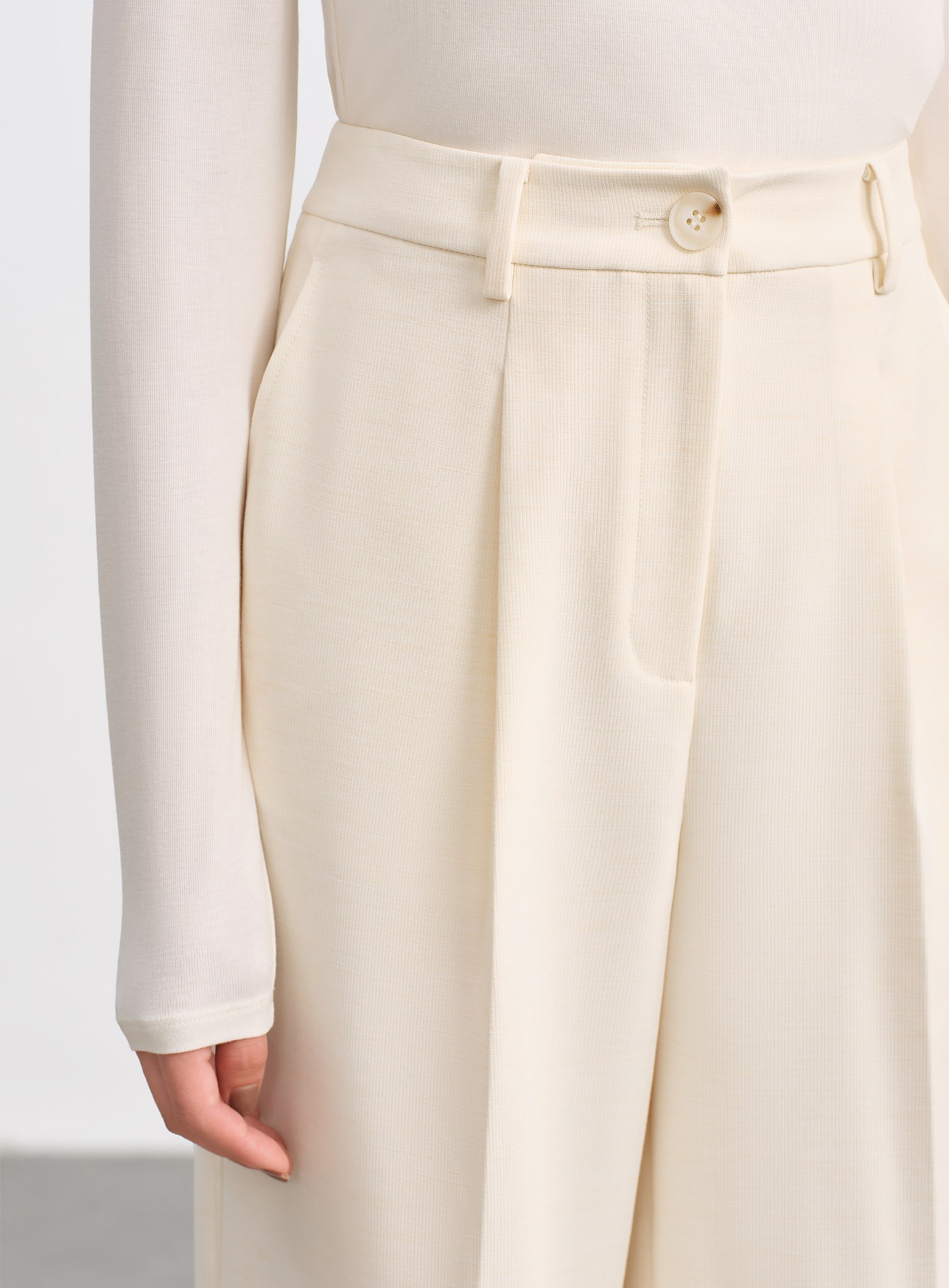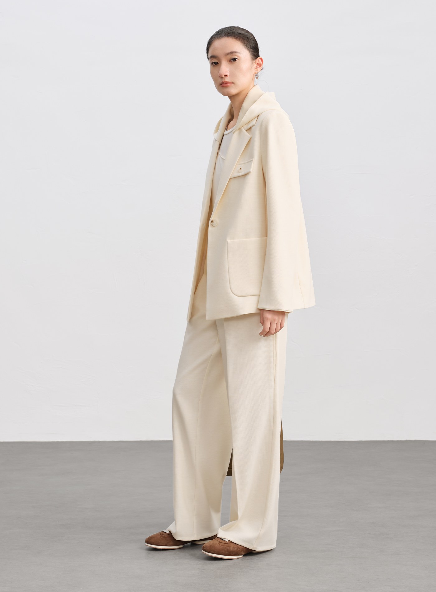 - 褲身前後片採用斜向裁剪,以短絨坑條絨素材拼接,自然修飾腿型