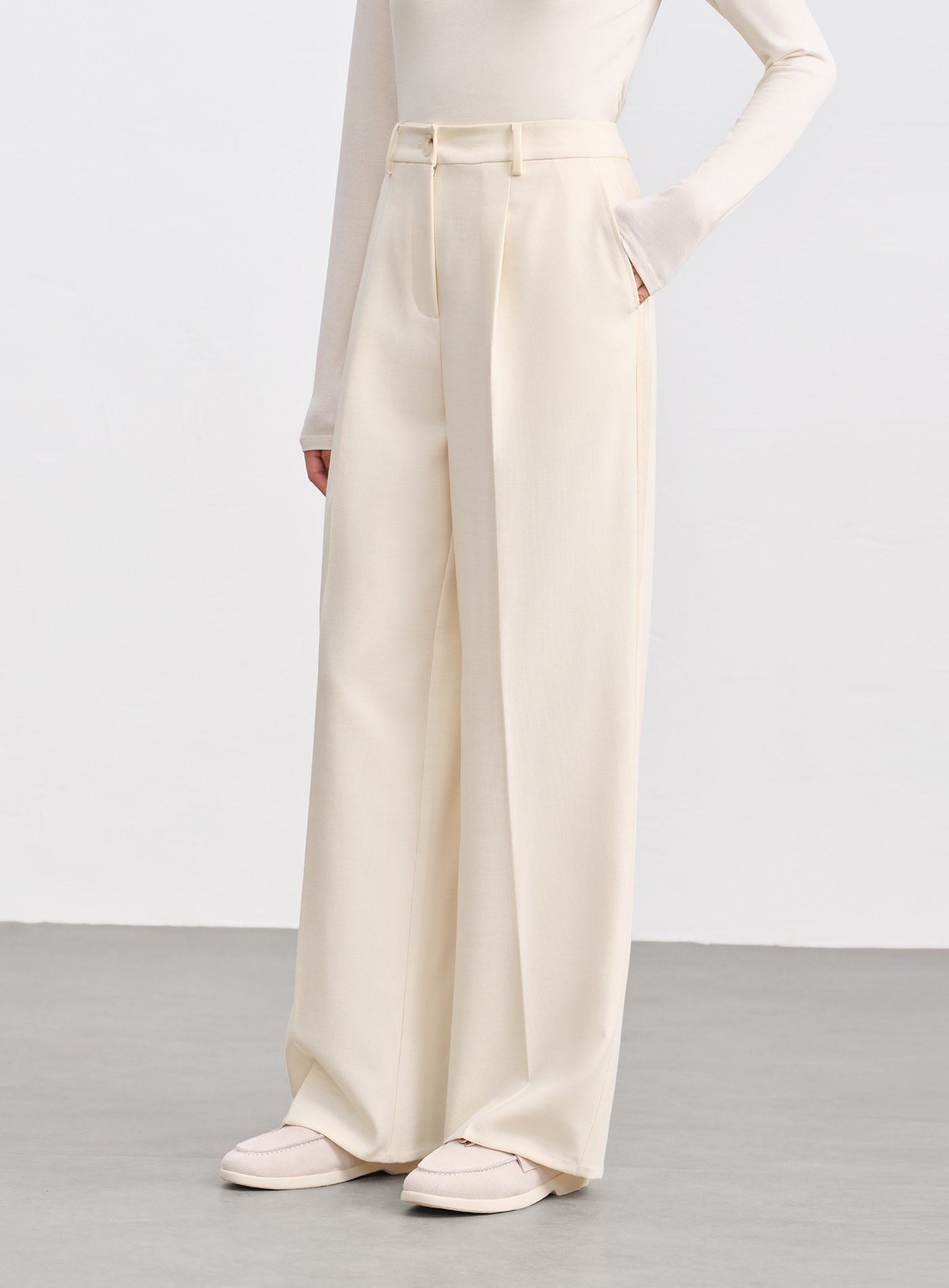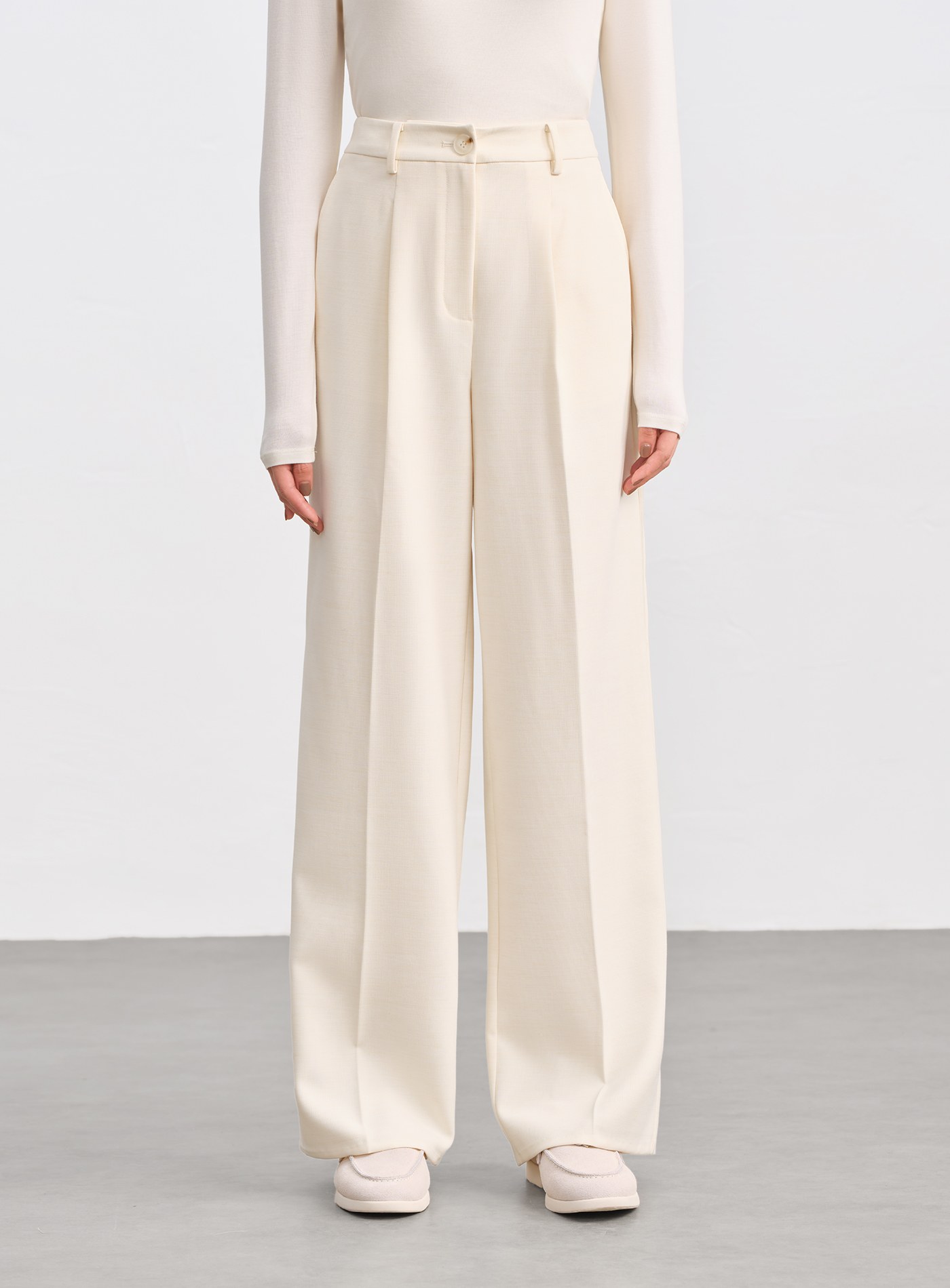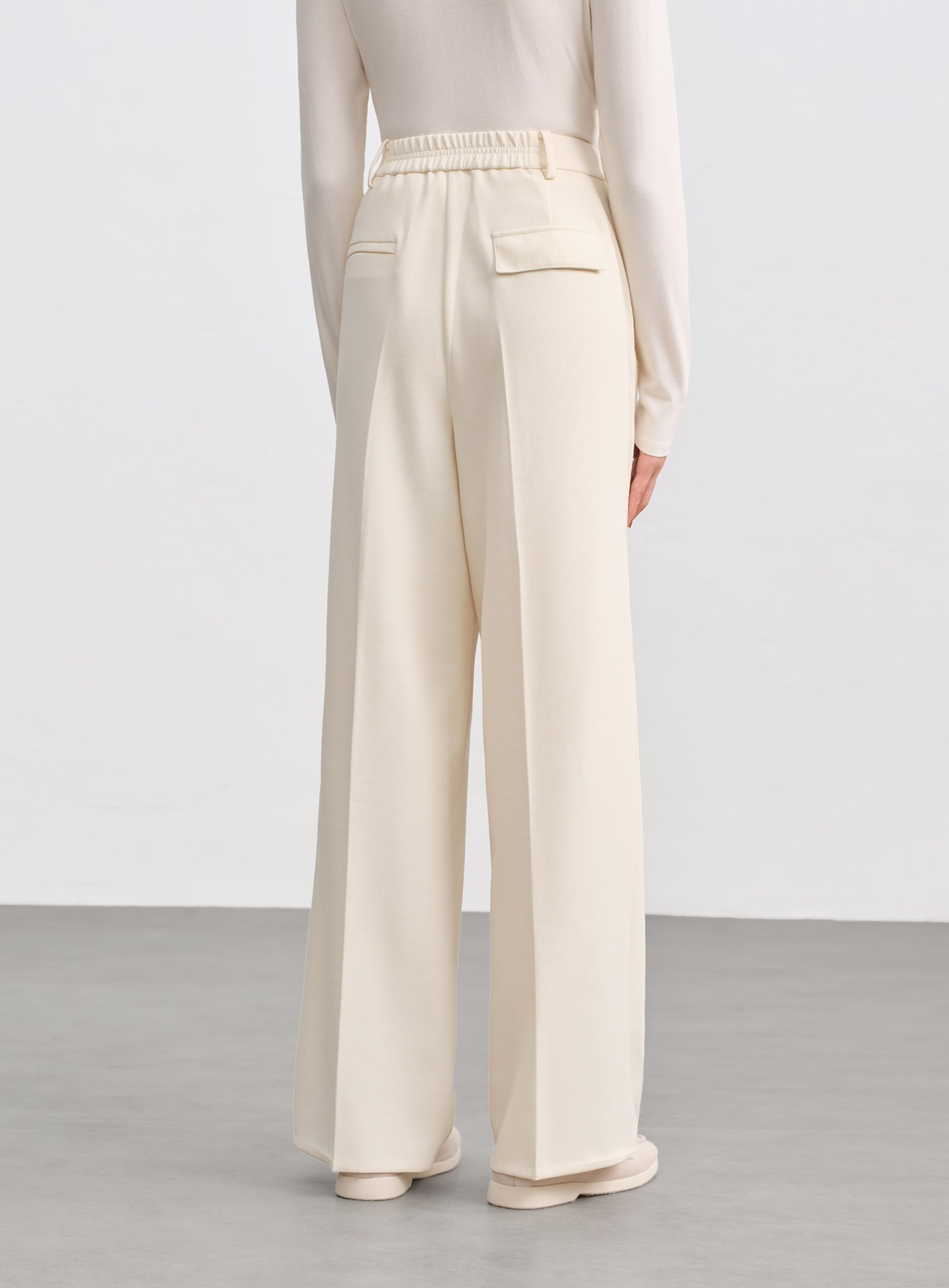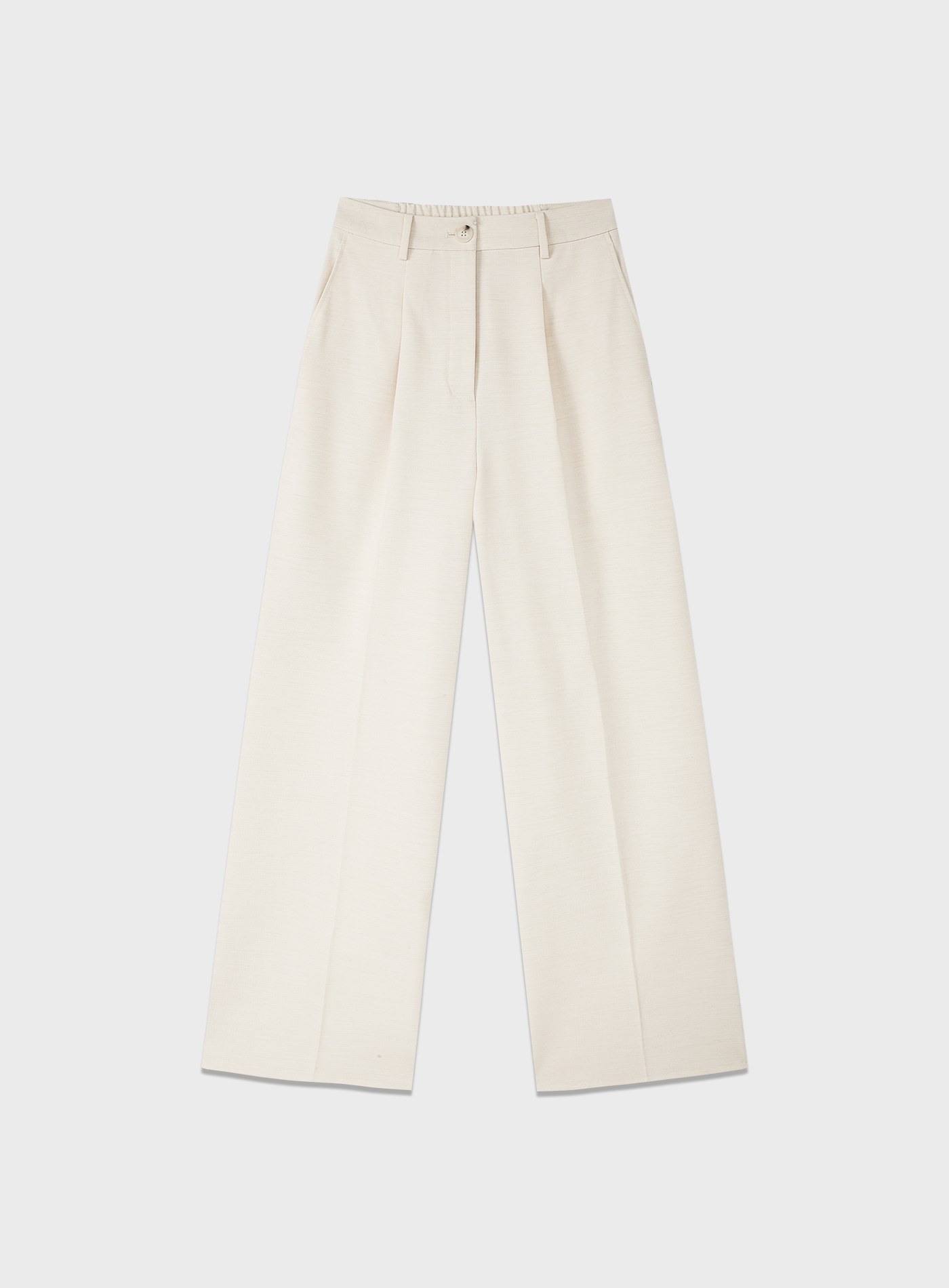 - 褲身前後片採用斜向裁剪,以短絨坑條絨素材拼接,自然修飾腿型