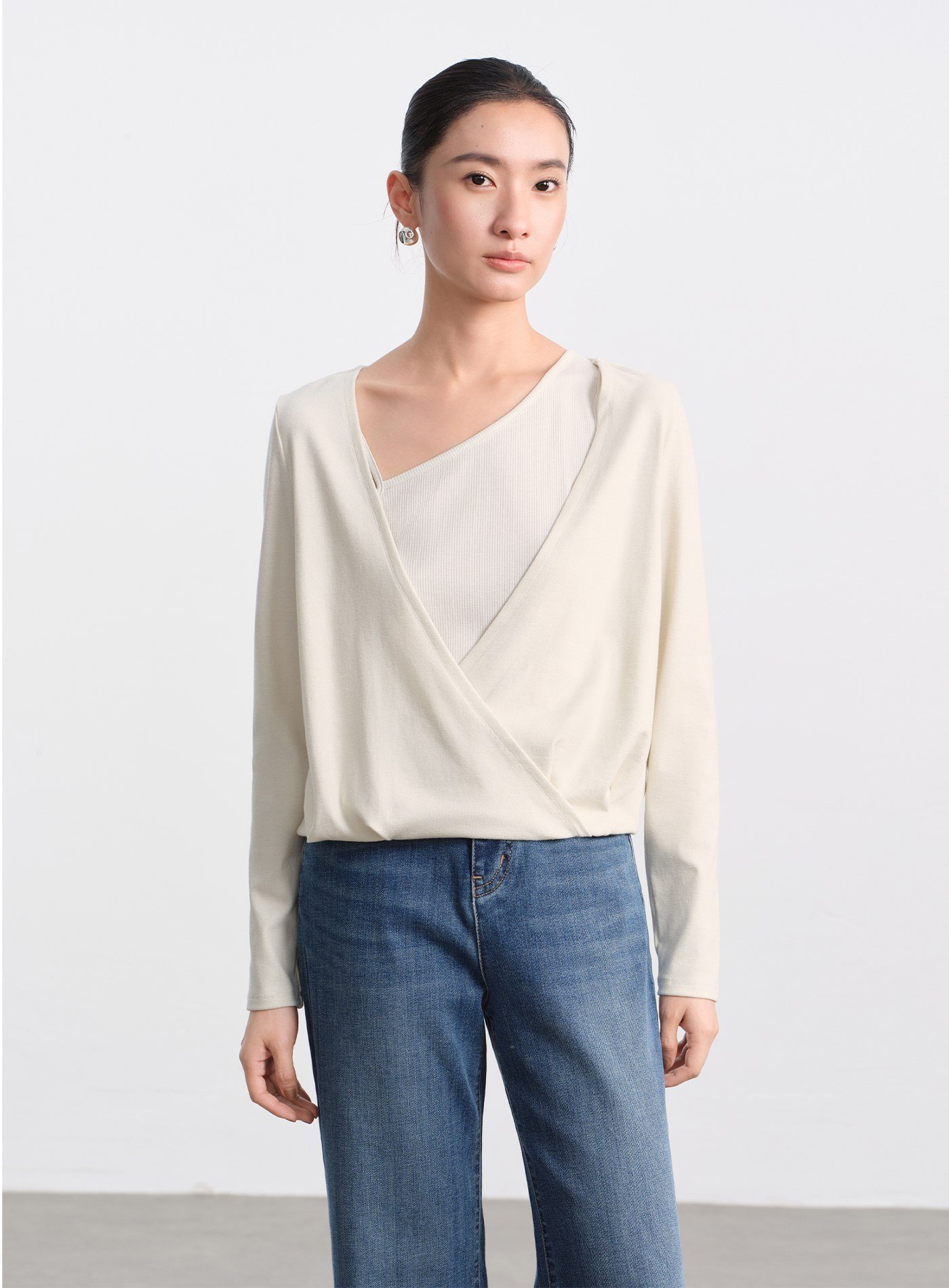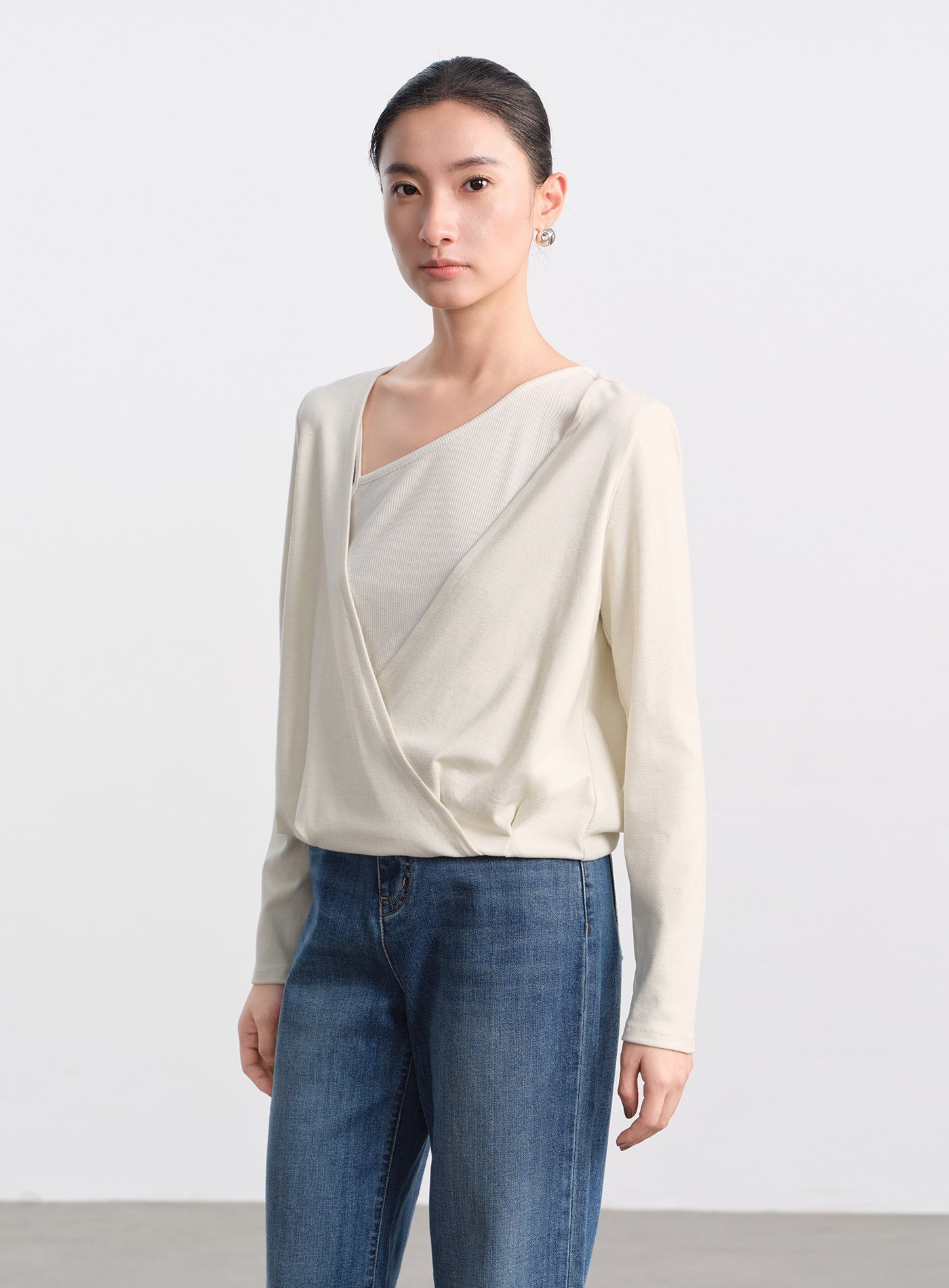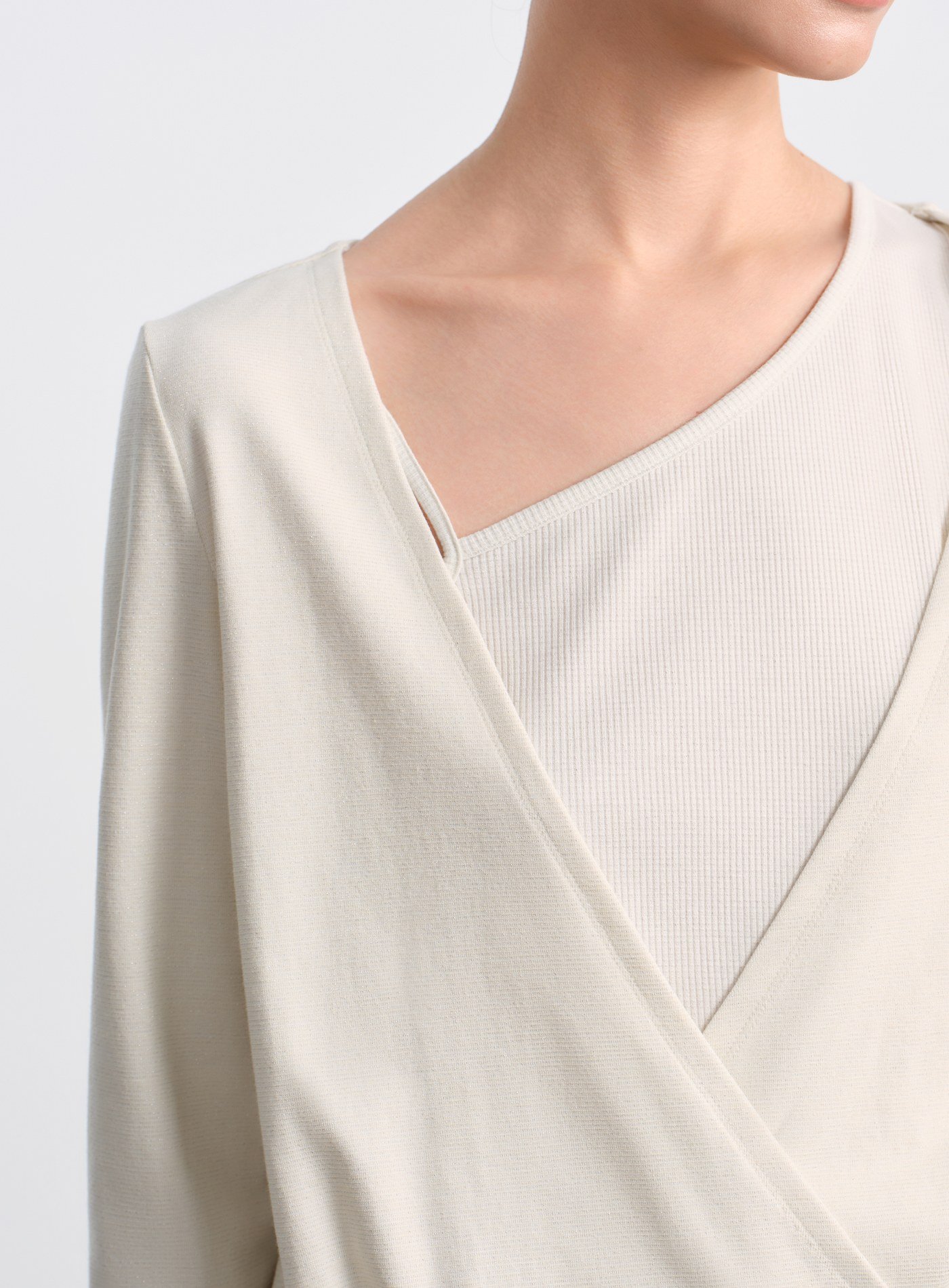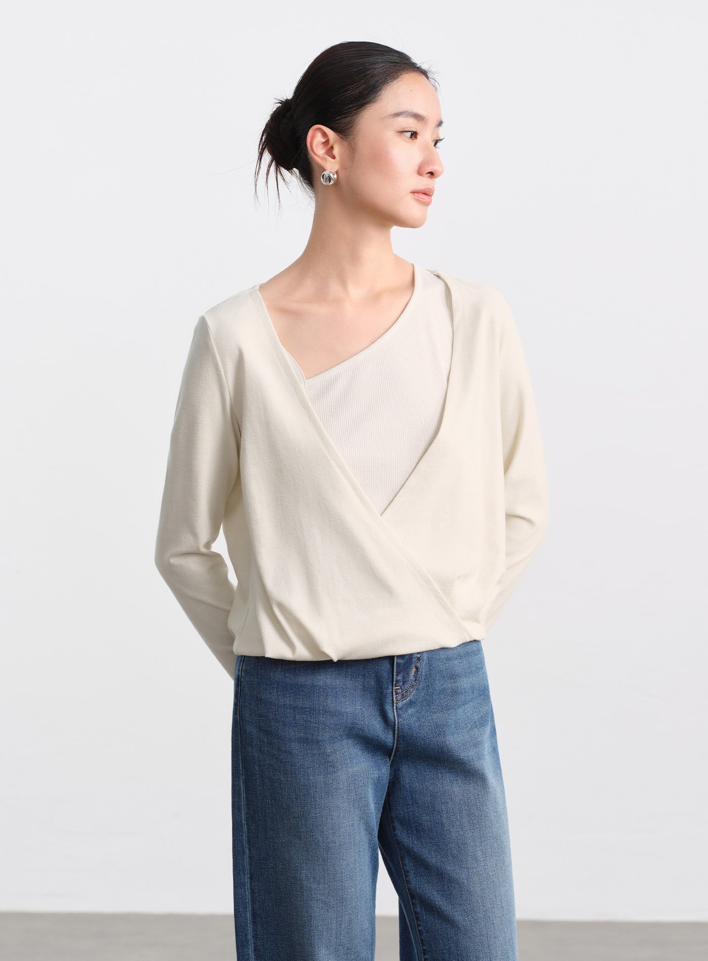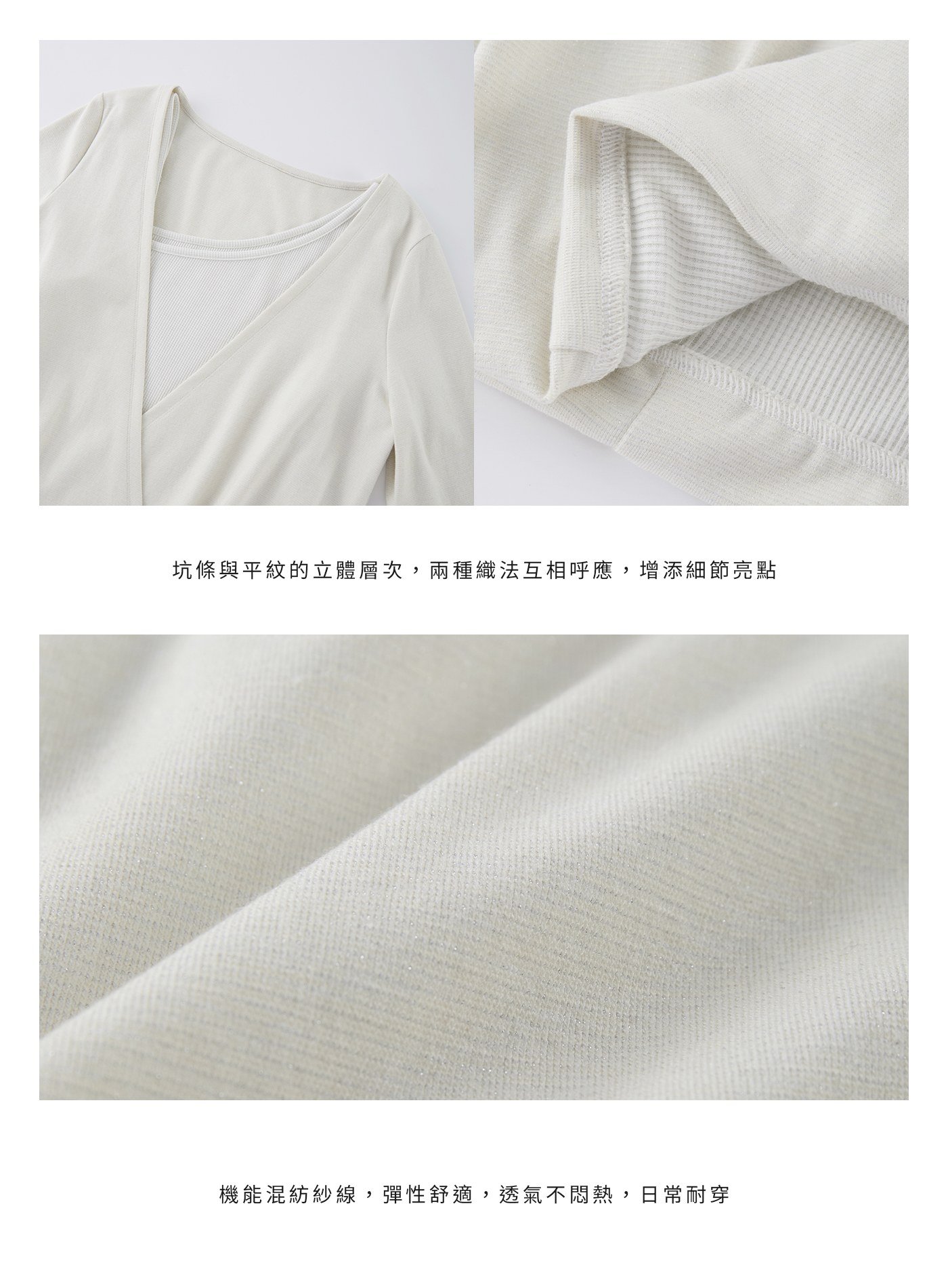 - 內層的不對稱坑條背心增添立體紋理,外層以 V 領平紋亮絲覆蓋,使垂墜線條更柔順