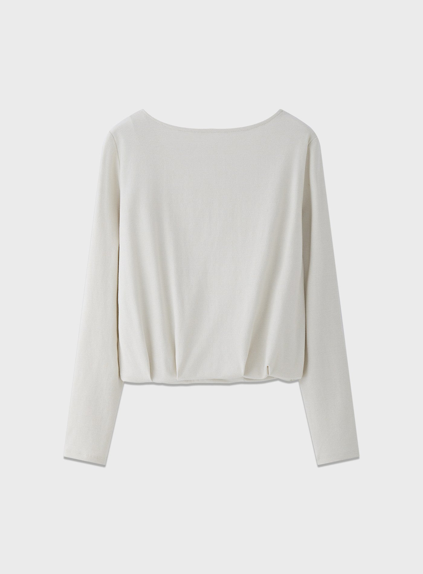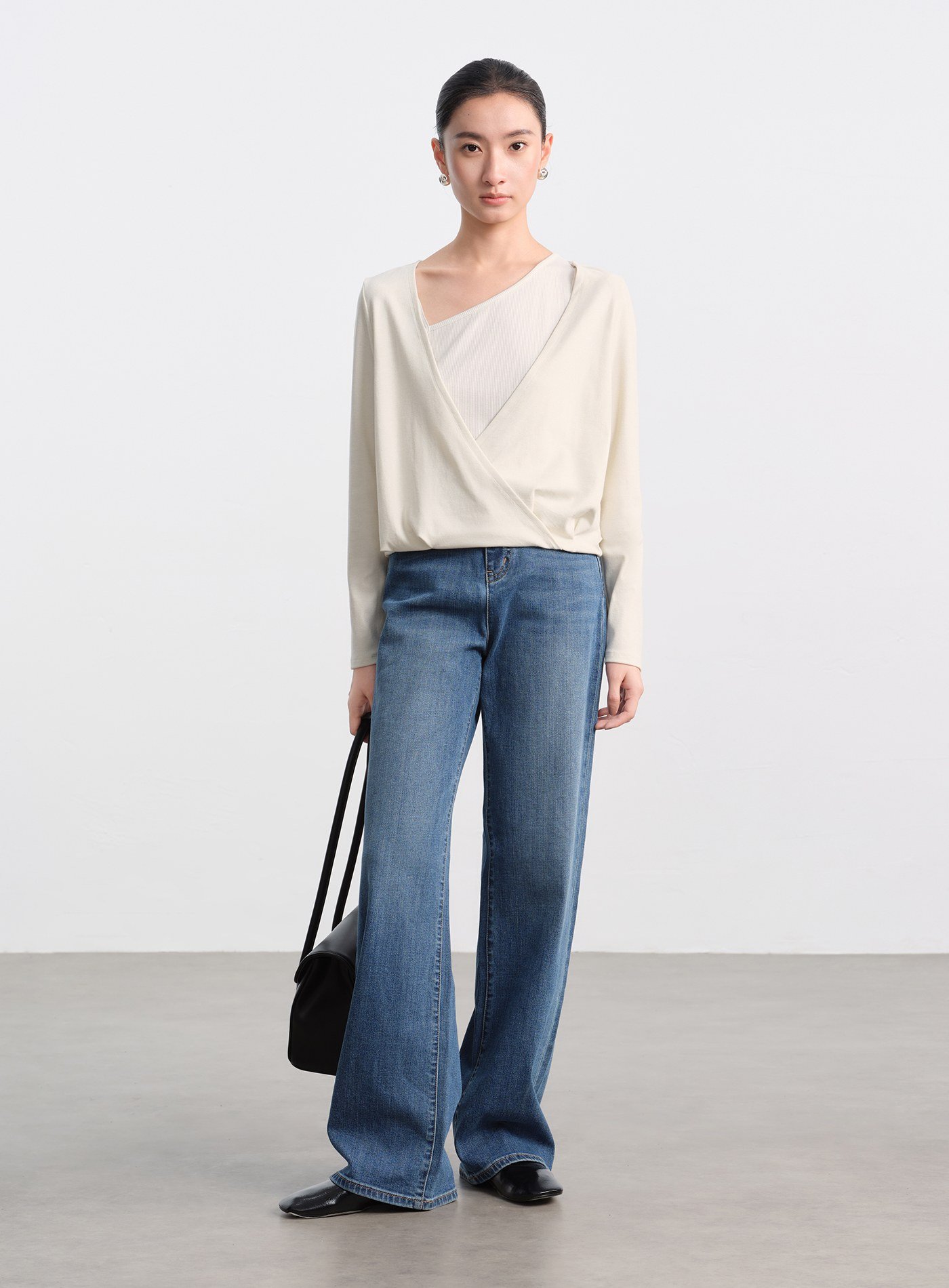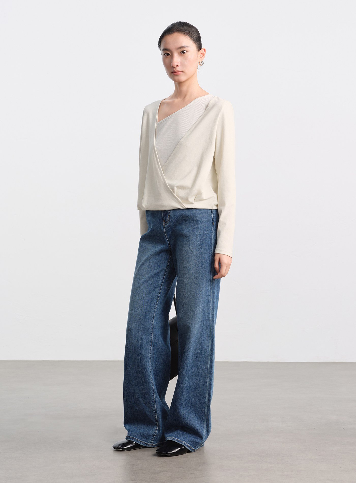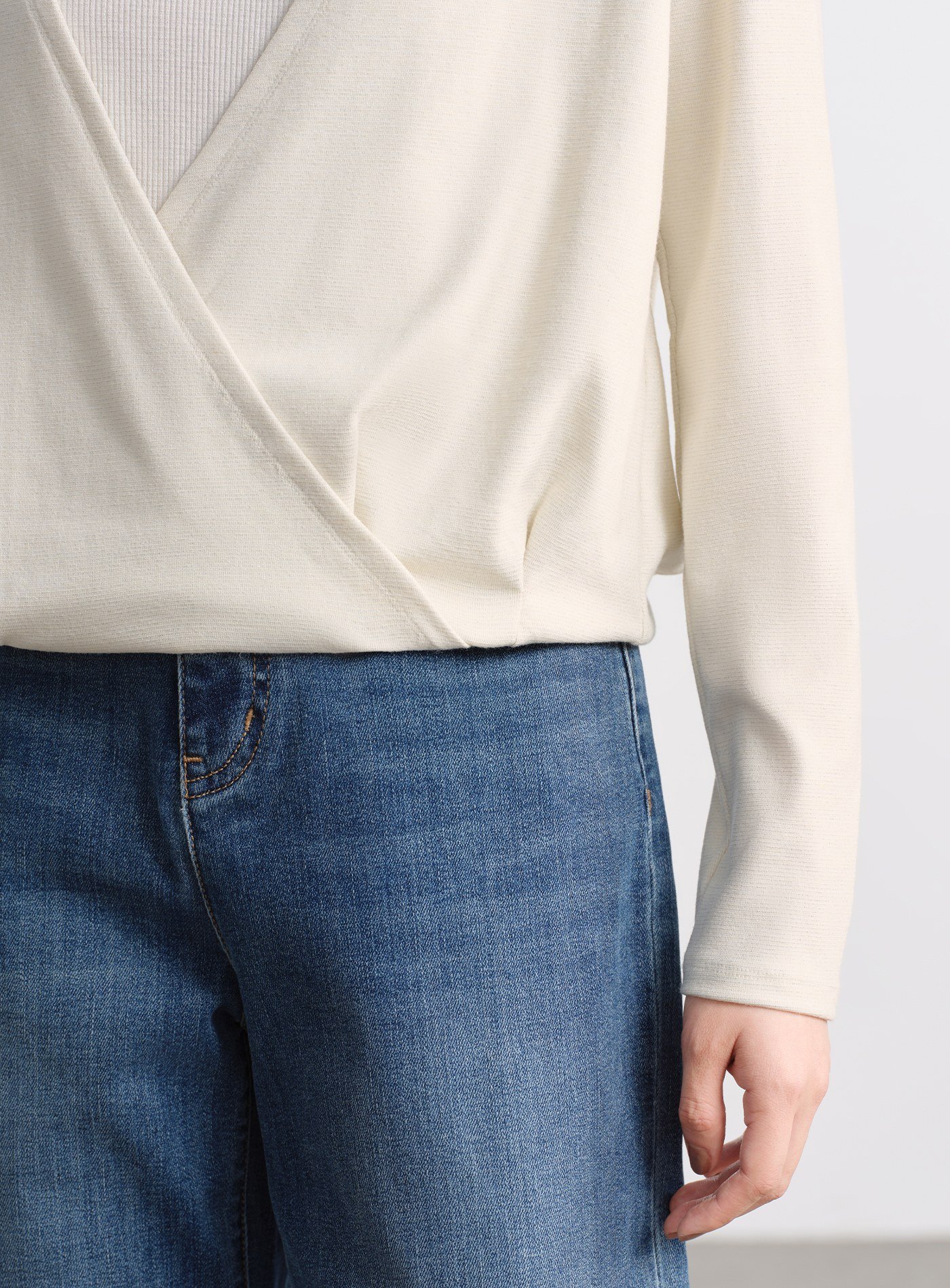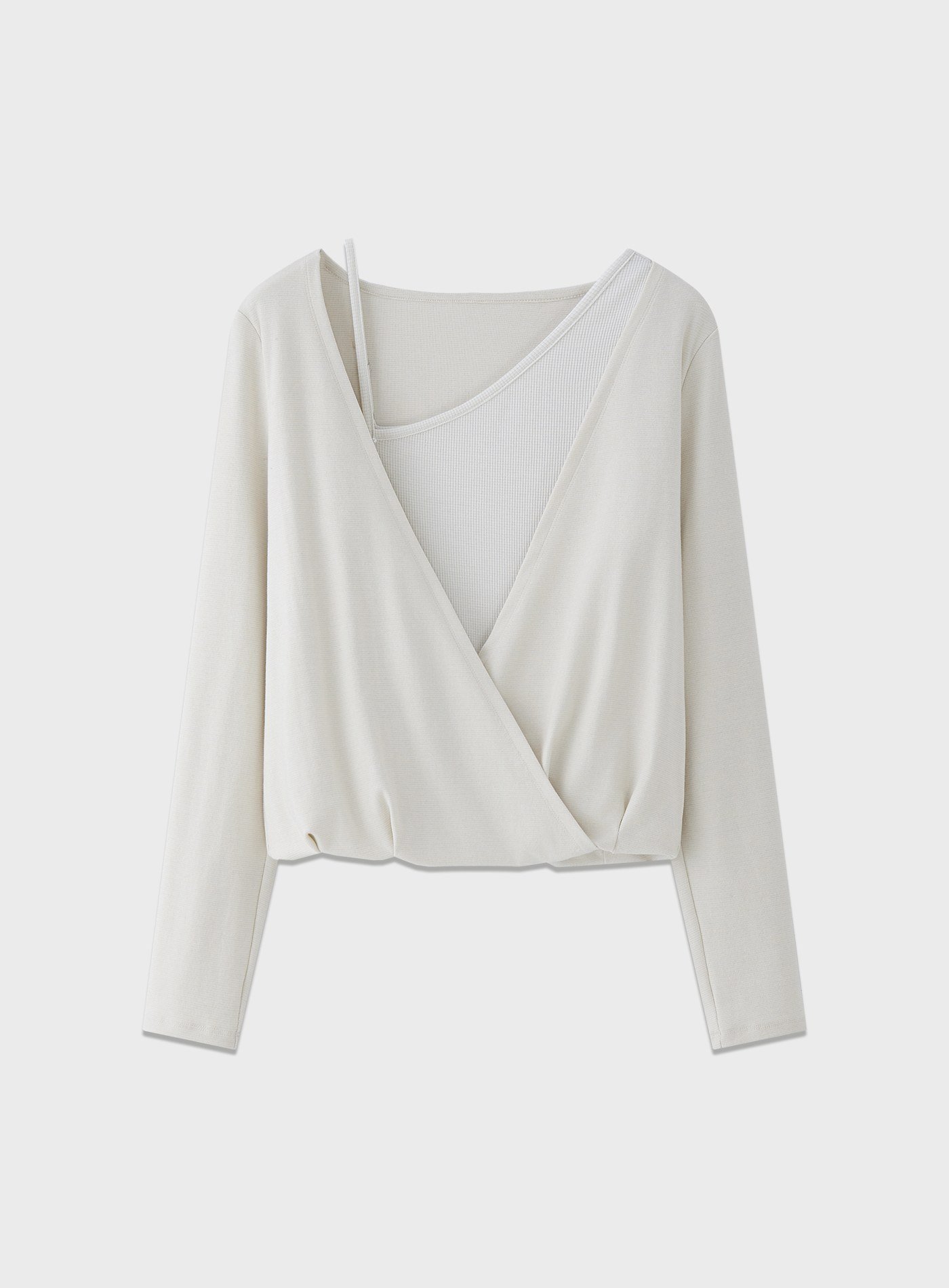 - 內層的不對稱坑條背心增添立體紋理,外層以 V 領平紋亮絲覆蓋,使垂墜線條更柔順