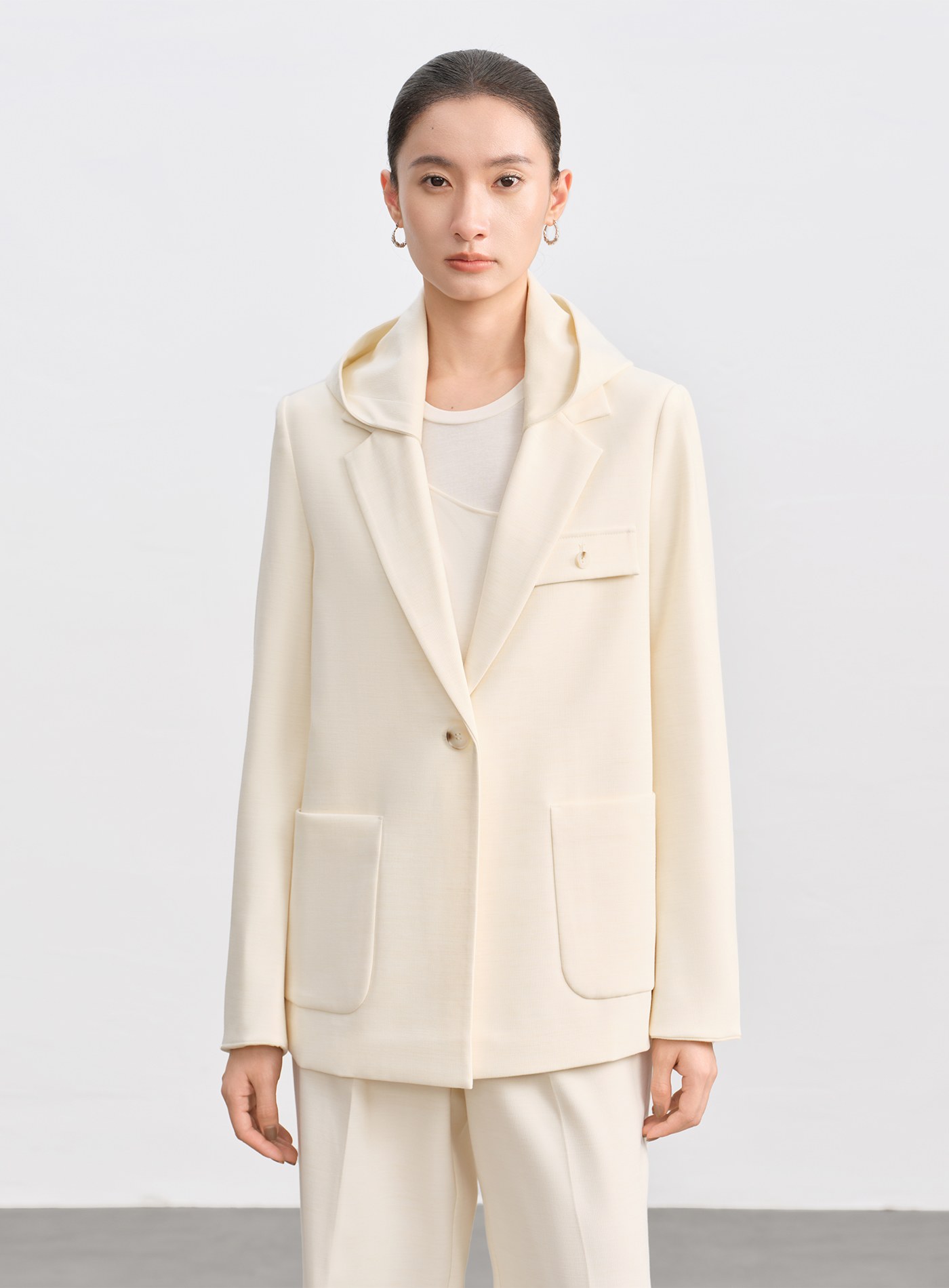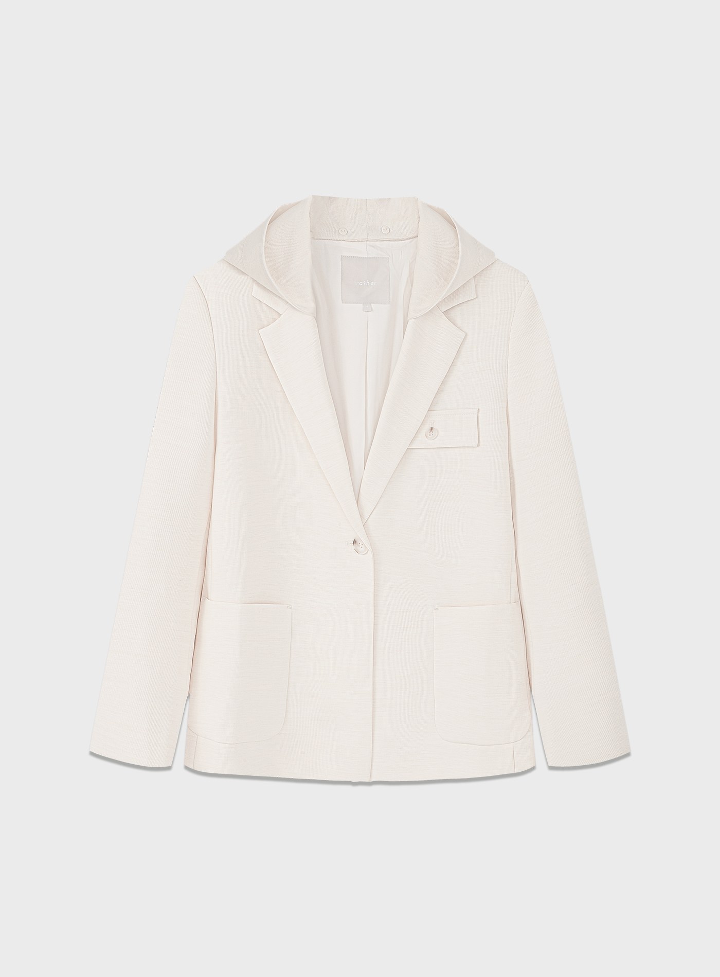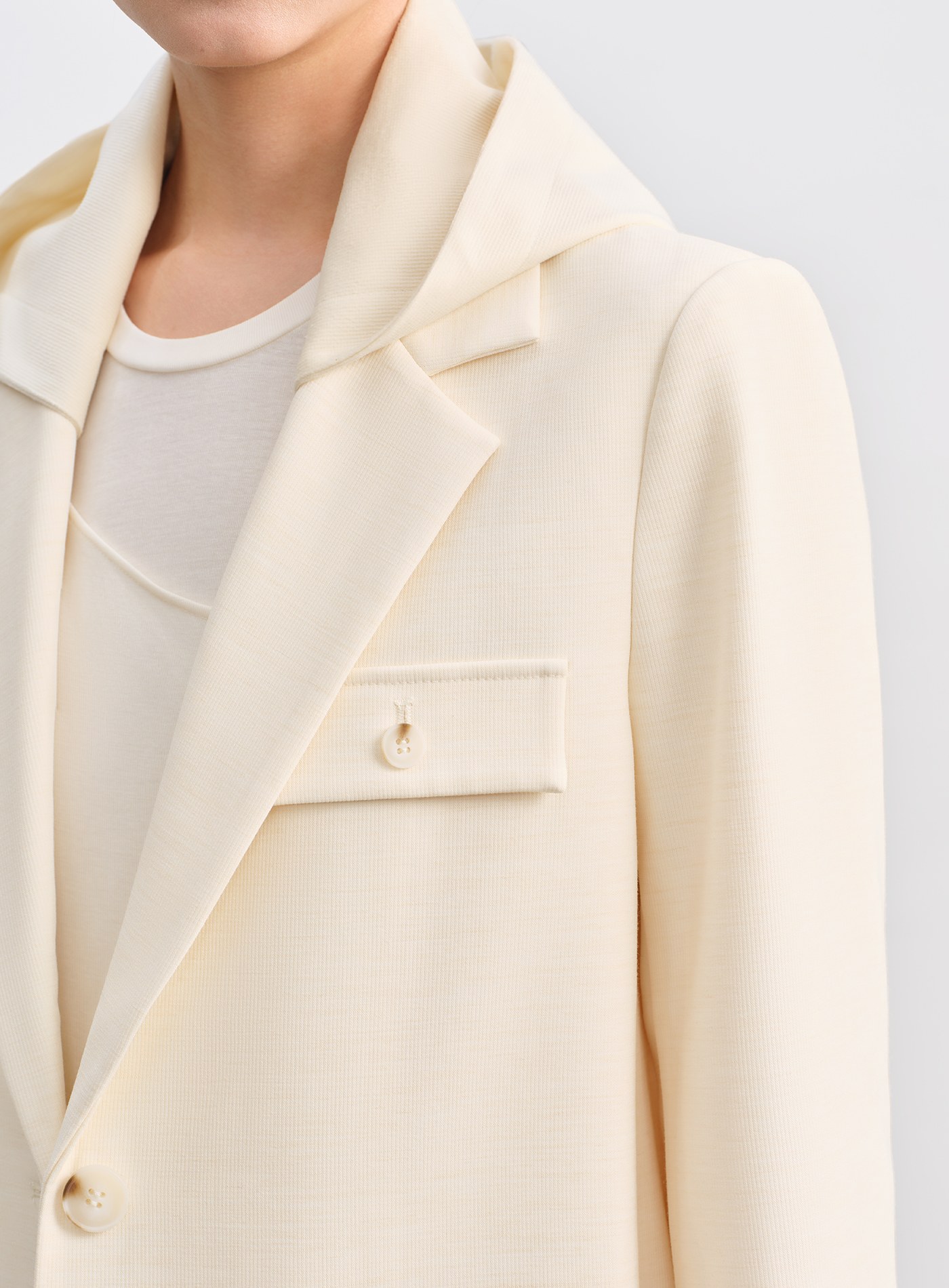 - 連帽與西裝領雙結構拼接,帽身弧度經過反覆調試,折疊收納後領型不變形