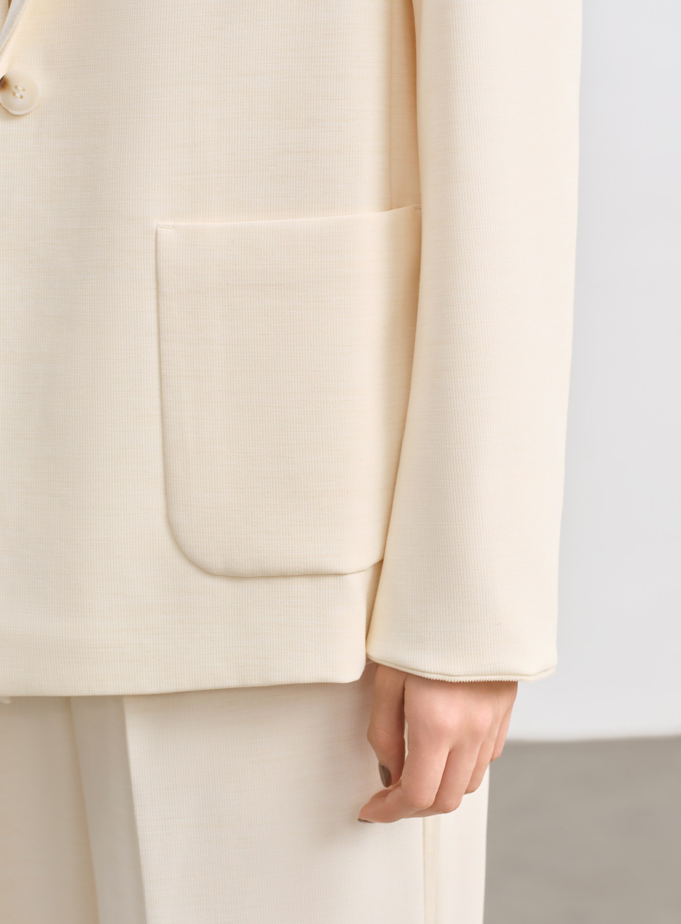 - 抗皺垂墜西裝布料與細膩的坑條絨布料拼撞,為正裝增添一點休閒感