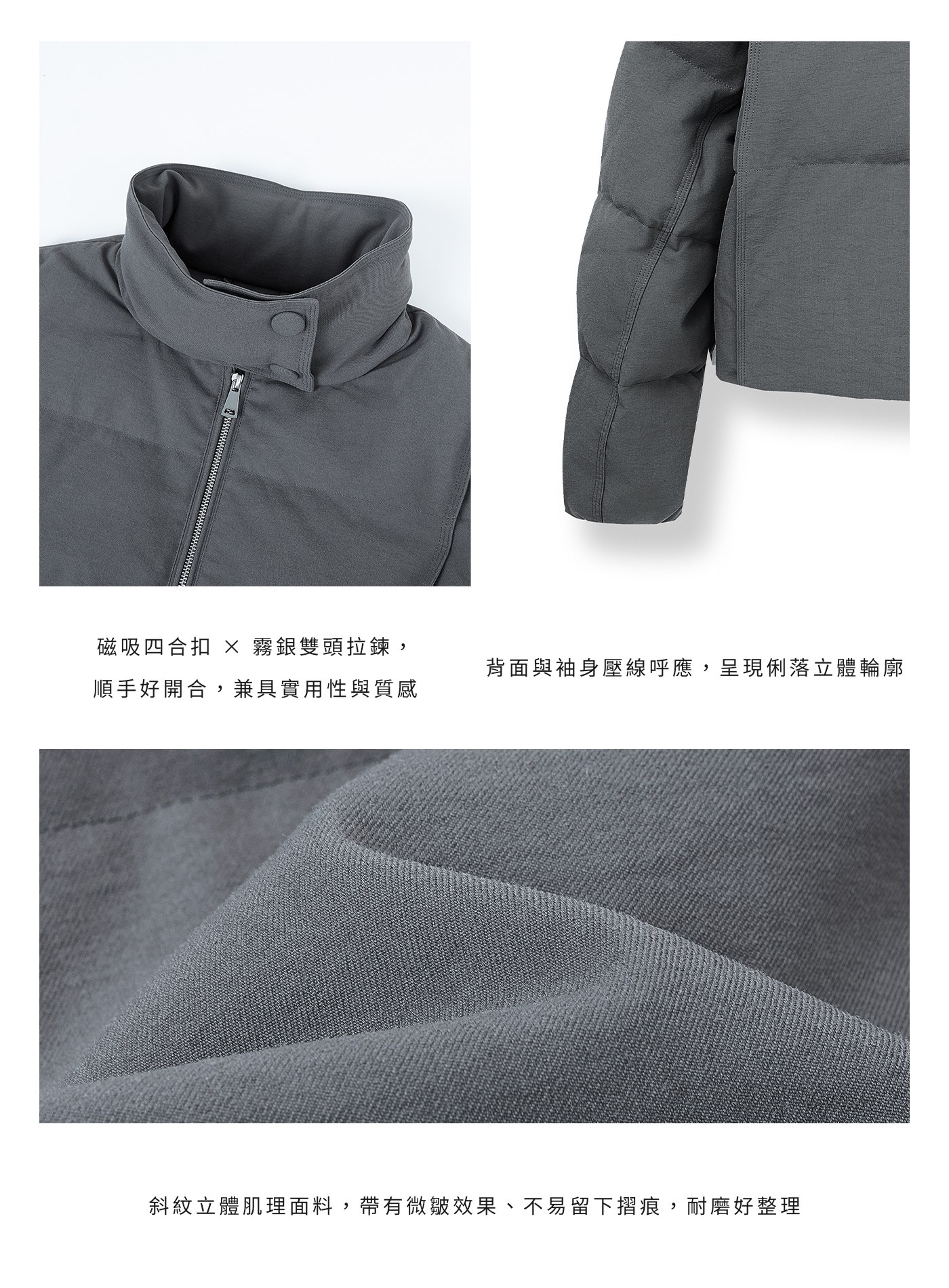 - 門襟採 磁吸四合扣 與 雙頭霧銀拉鍊,開合俐落順暢,日常穿脫方便