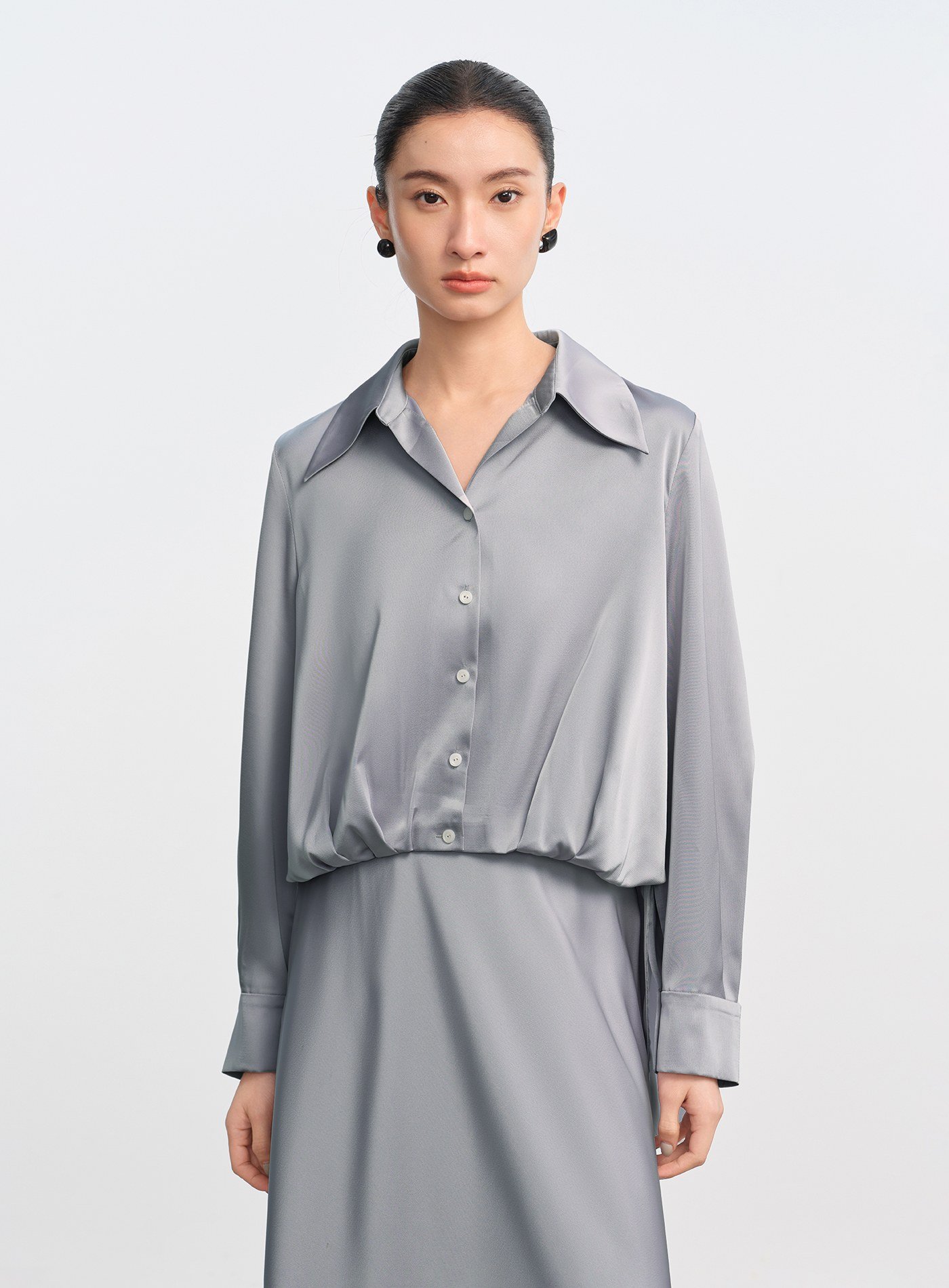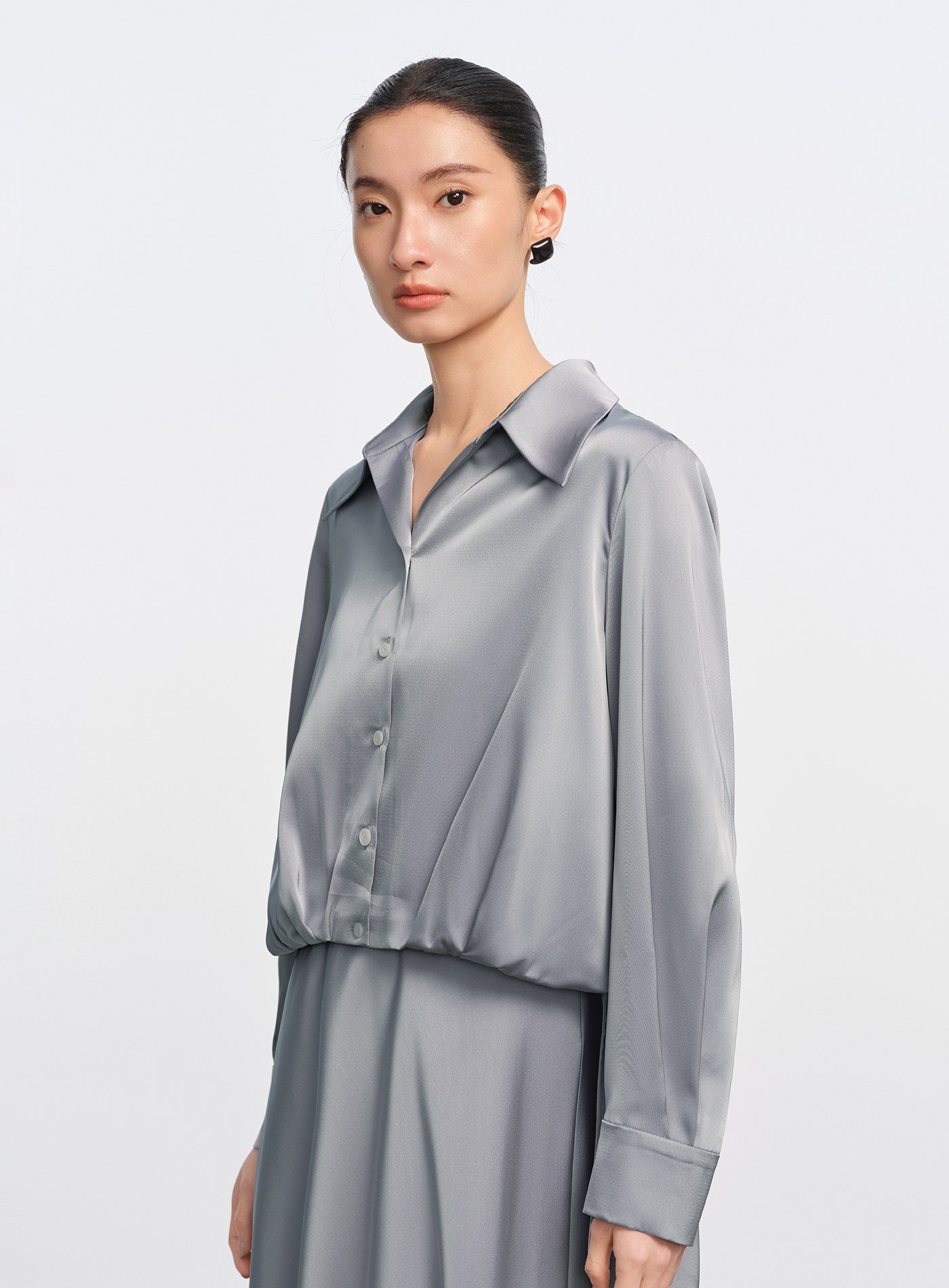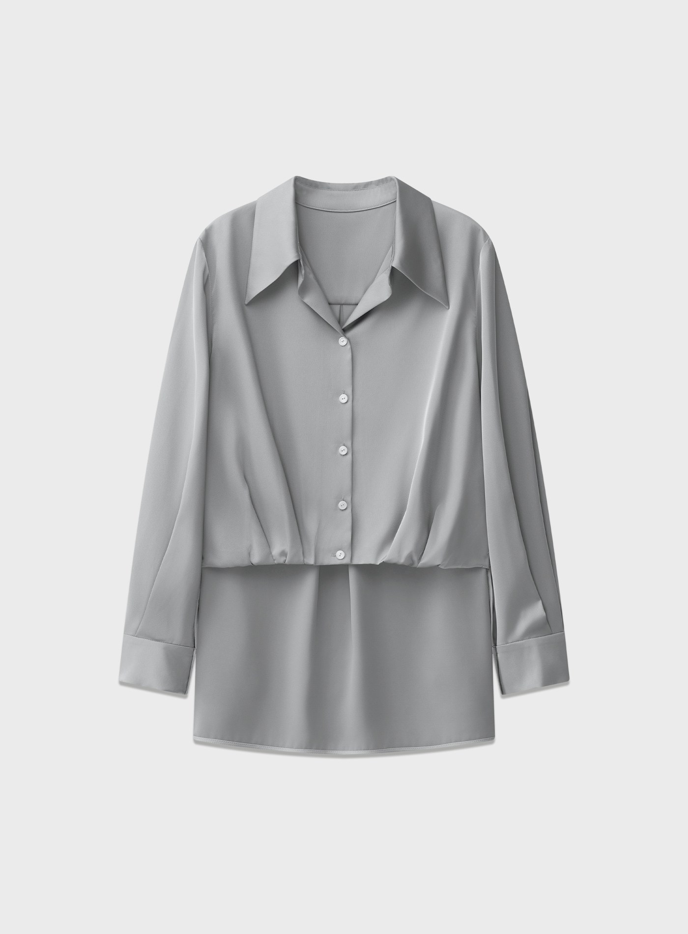 - 前短後長的衣擺剪裁與下擺打褶內收設計