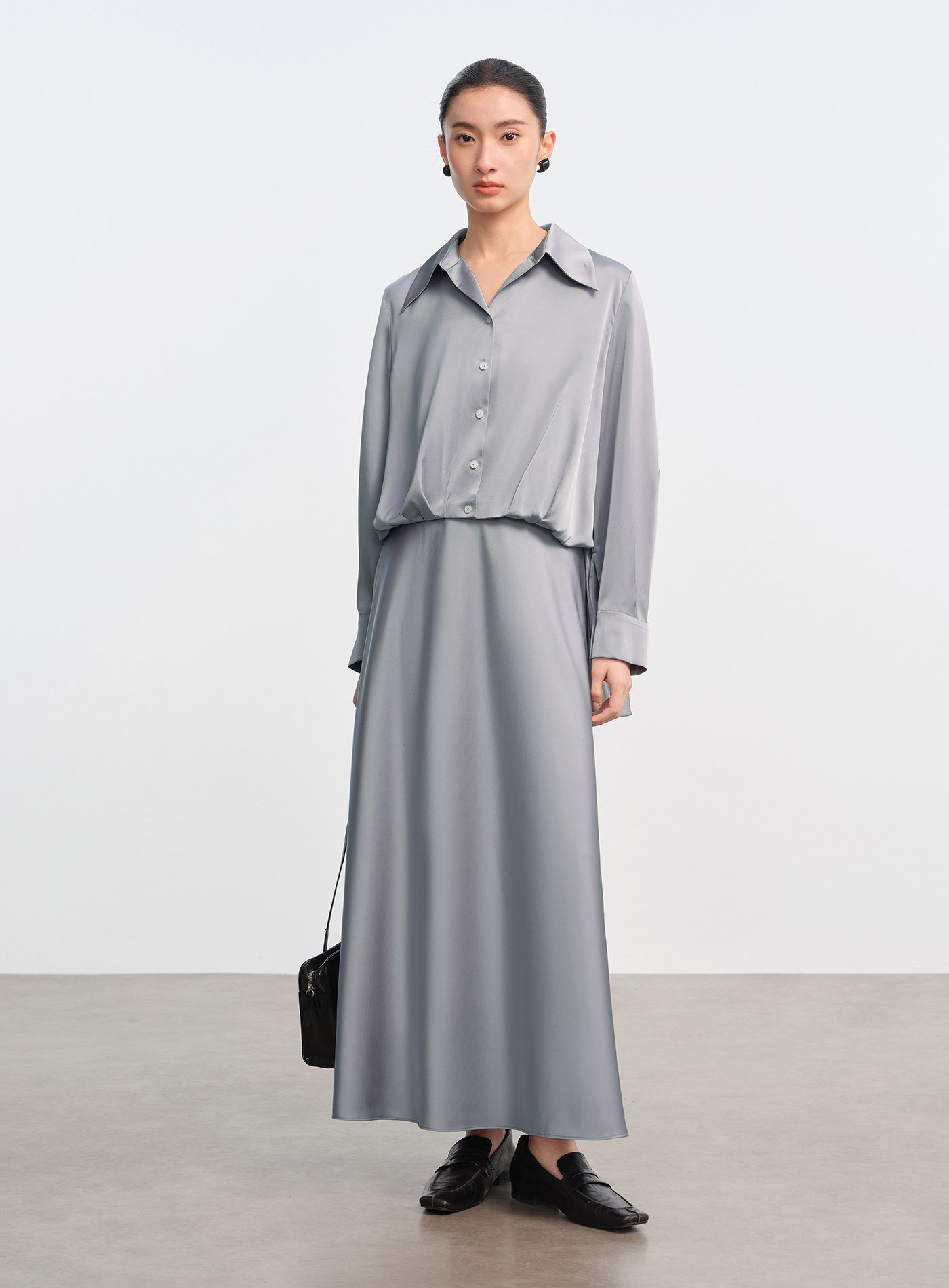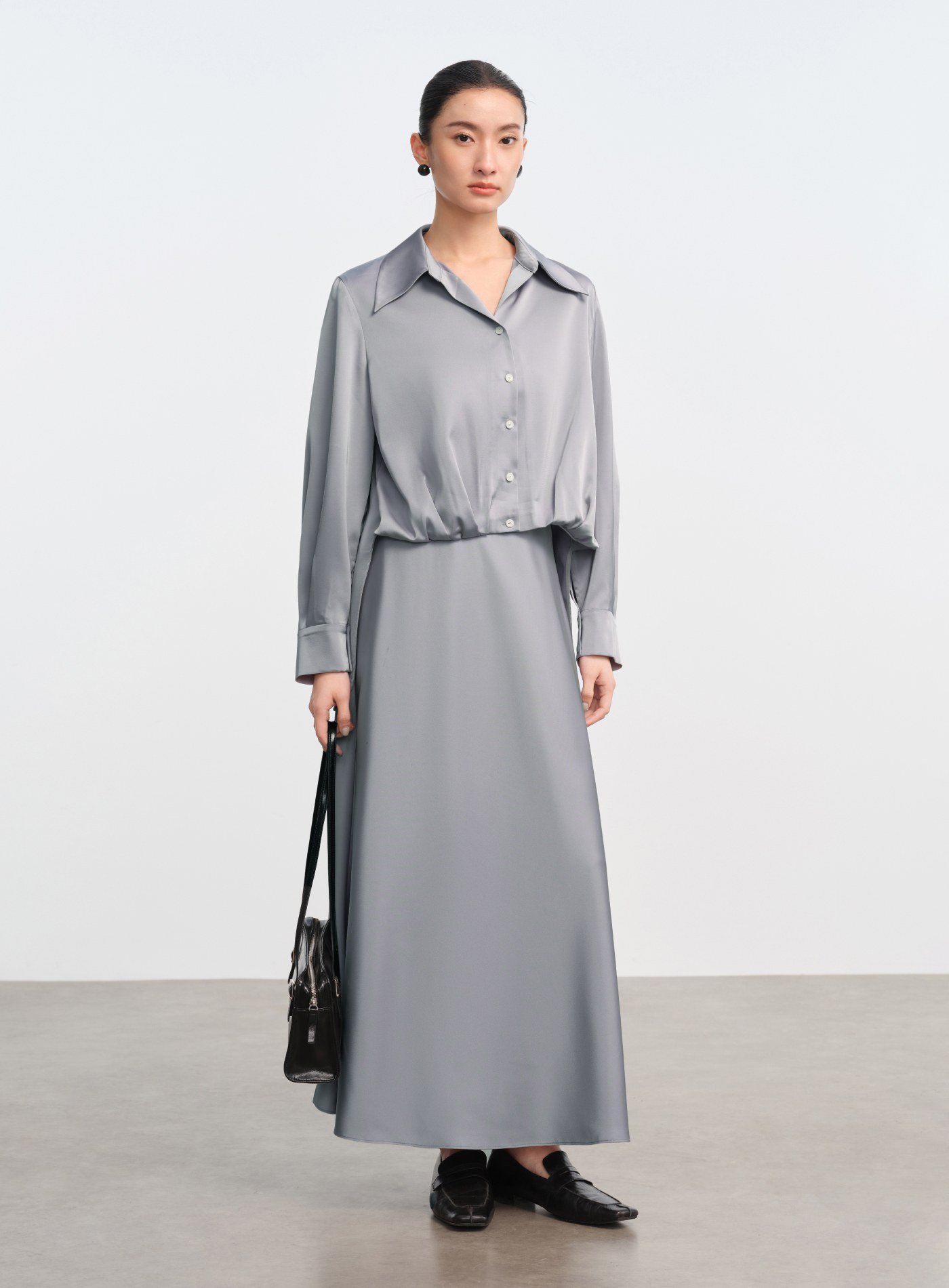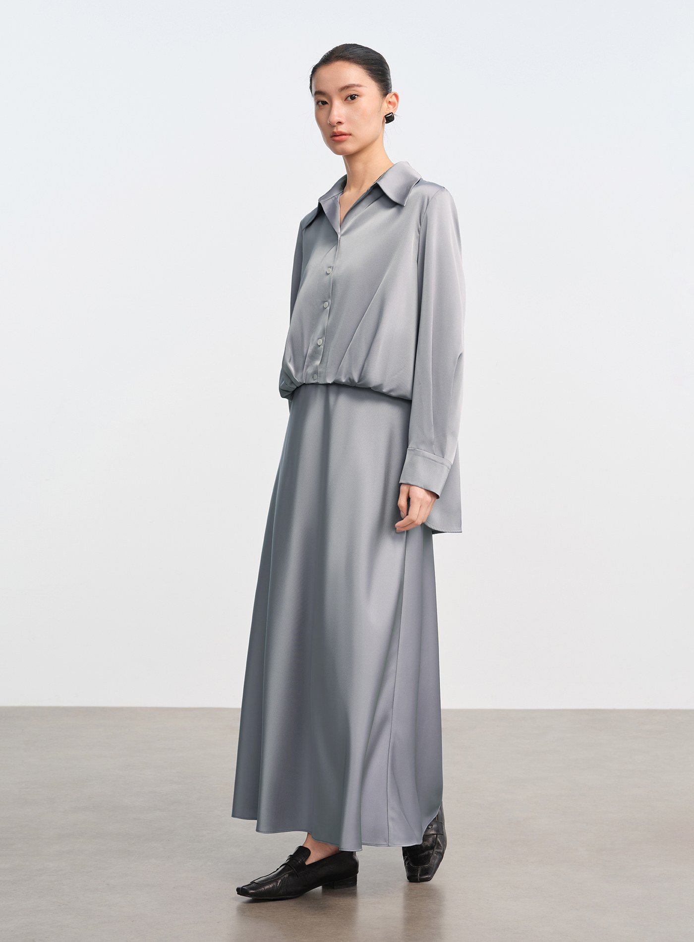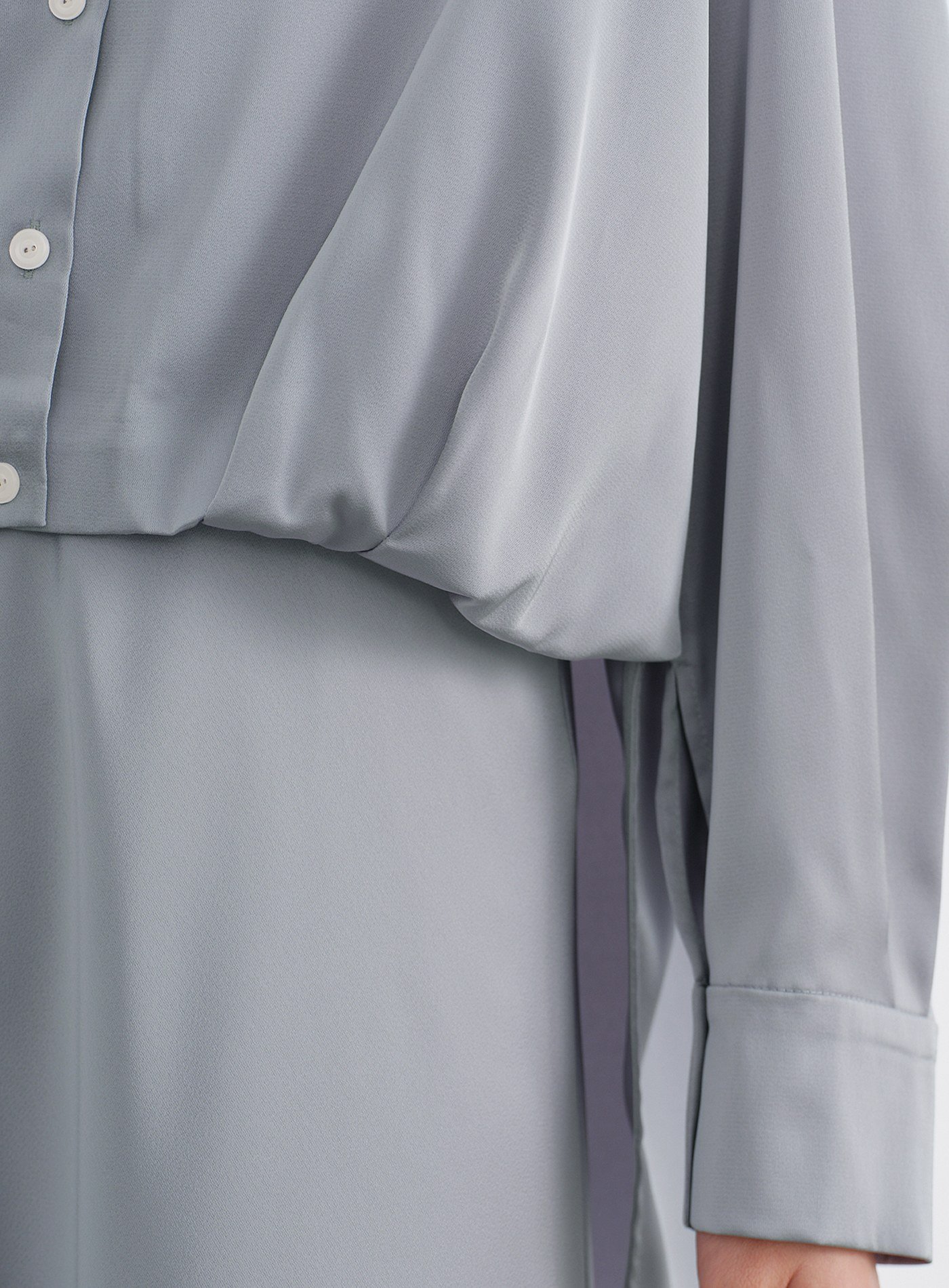 - 前短後長的衣擺剪裁與下擺打褶內收設計