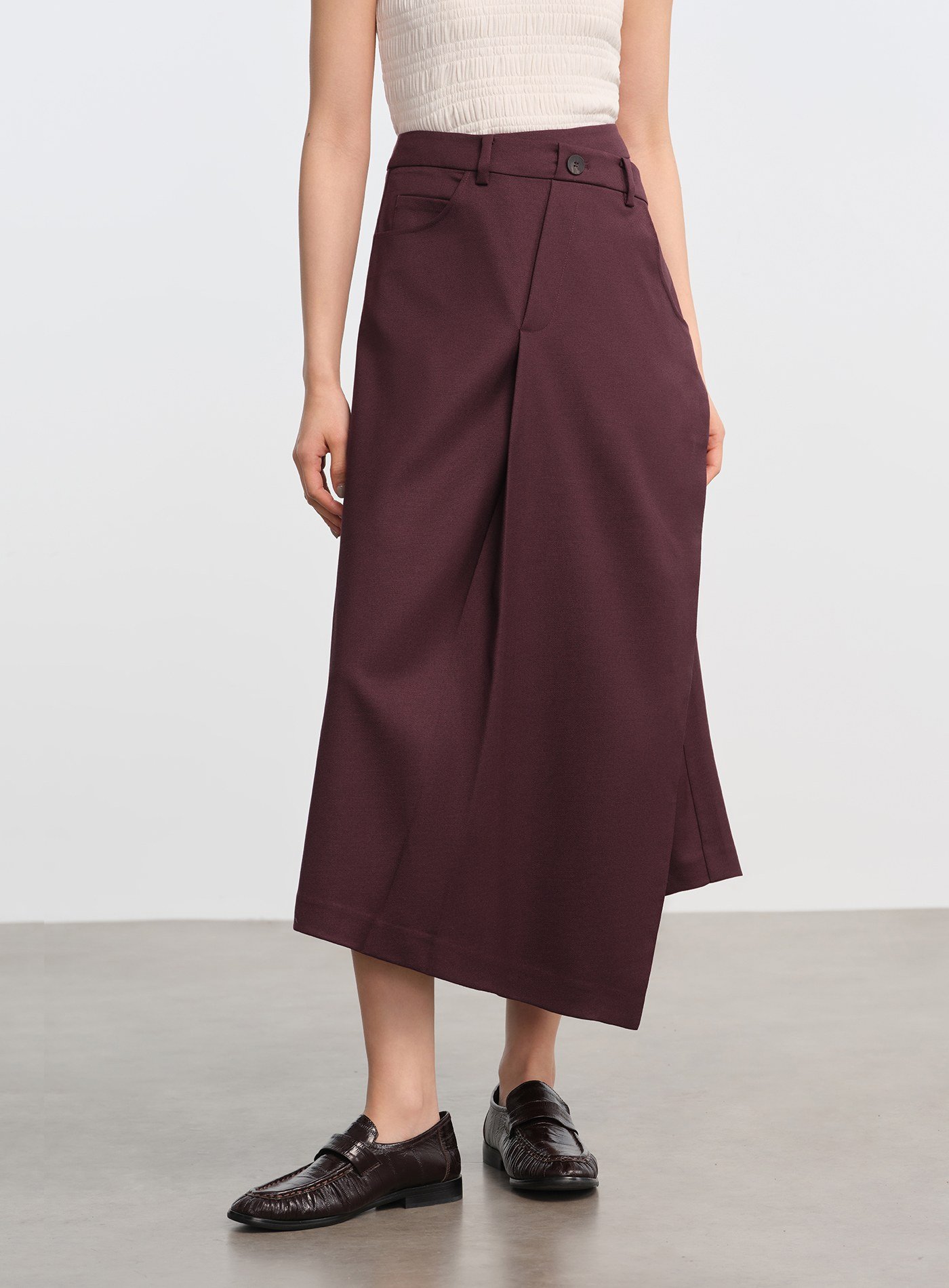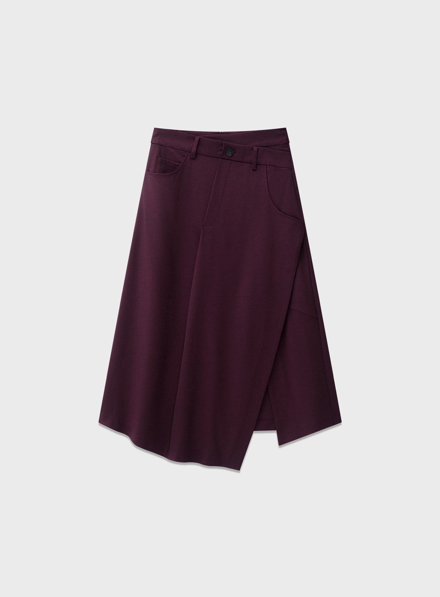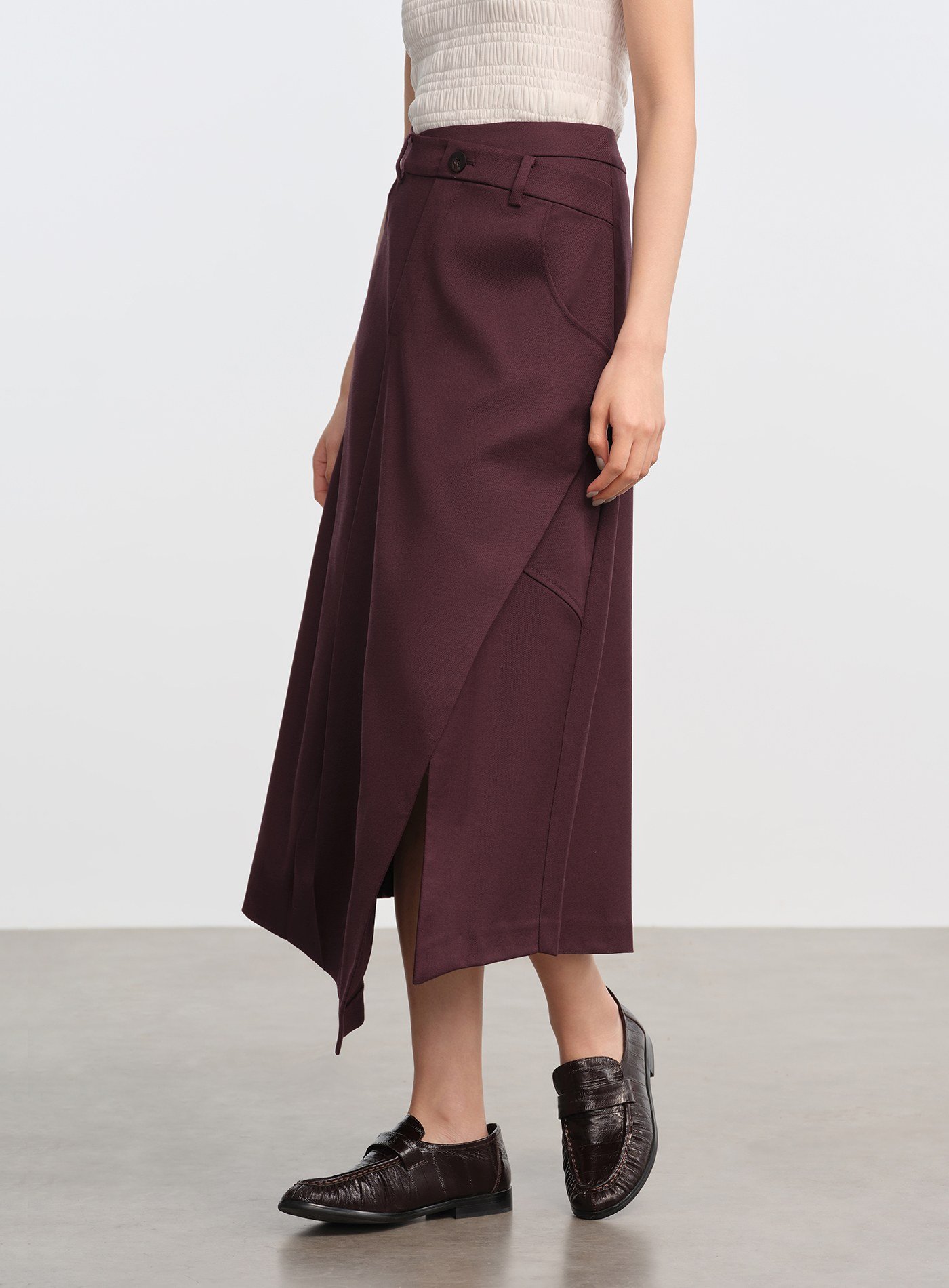 - 前片斜向剪裁與開衩細節,行走時裙擺層次豐富,下擺錯落設計增添輕盈感