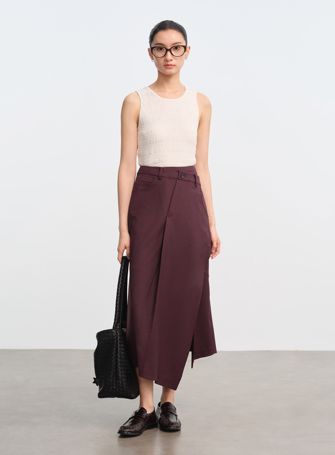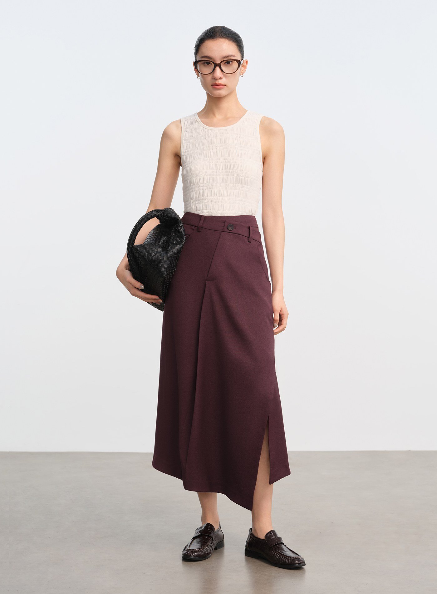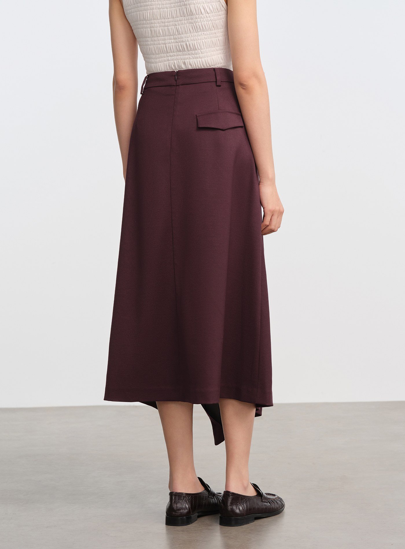 - 前片斜向剪裁與開衩細節,行走時裙擺層次豐富,下擺錯落設計增添輕盈感