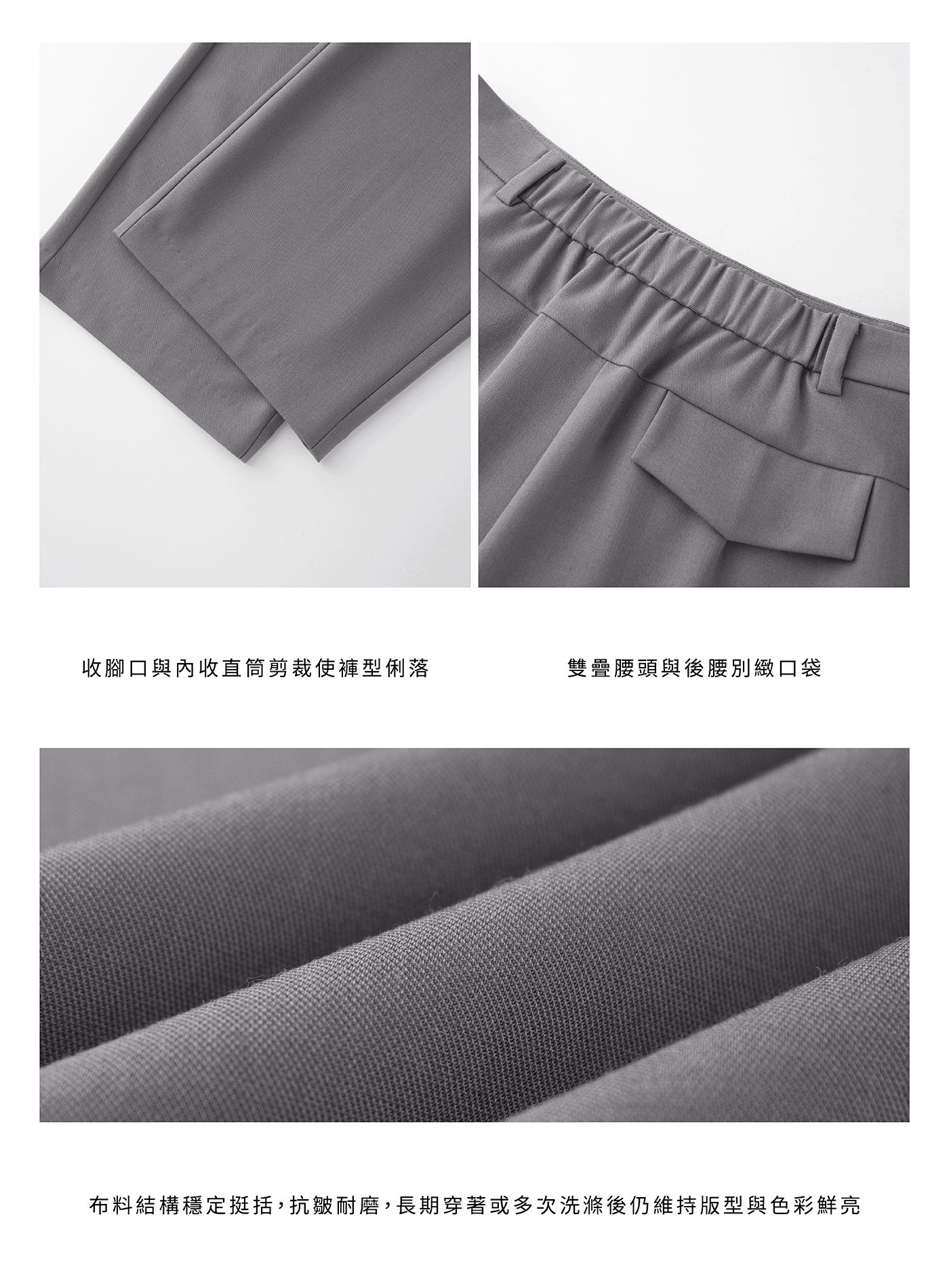 - 正面俐落腰頭與背部鬆緊設計兼具舒適與修飾效果